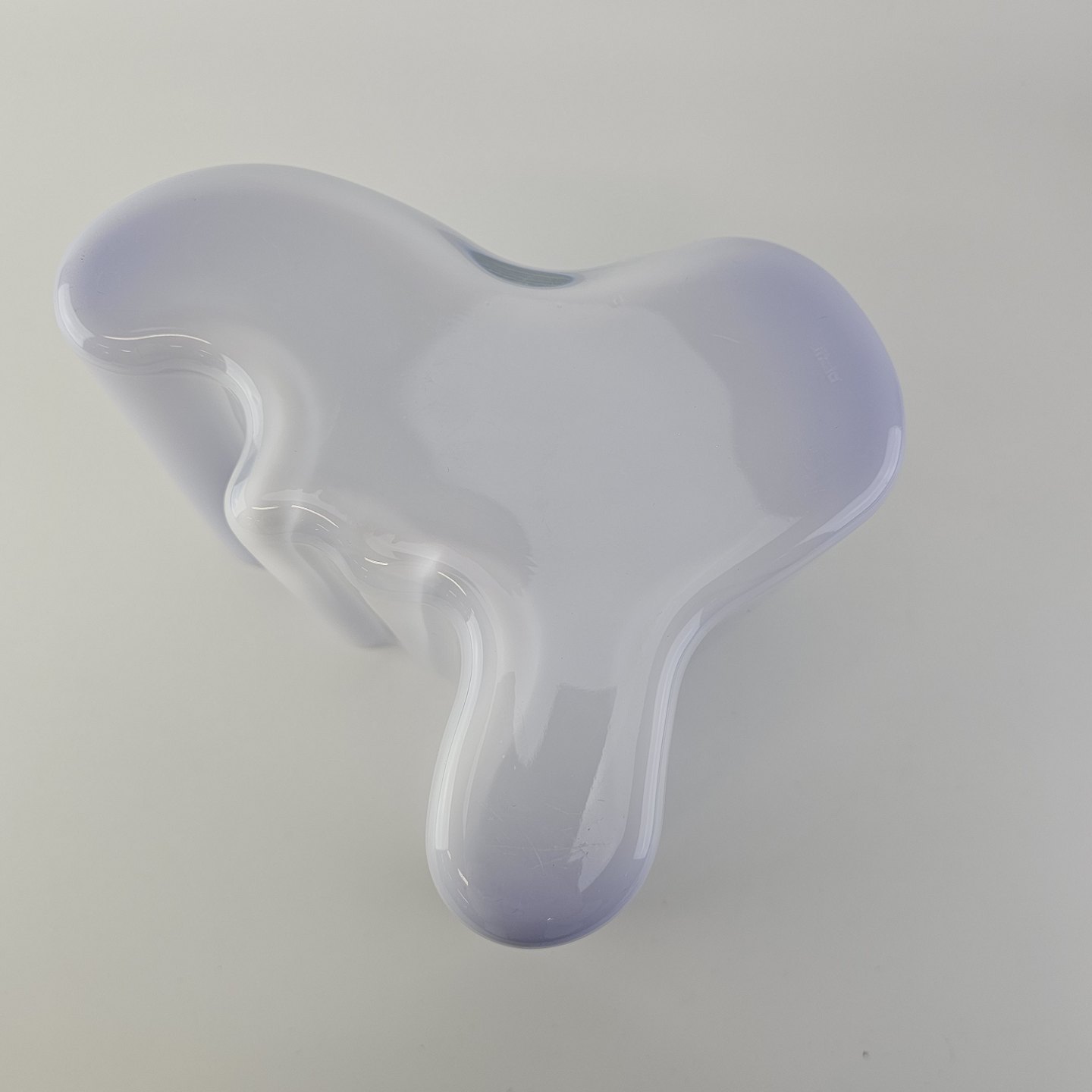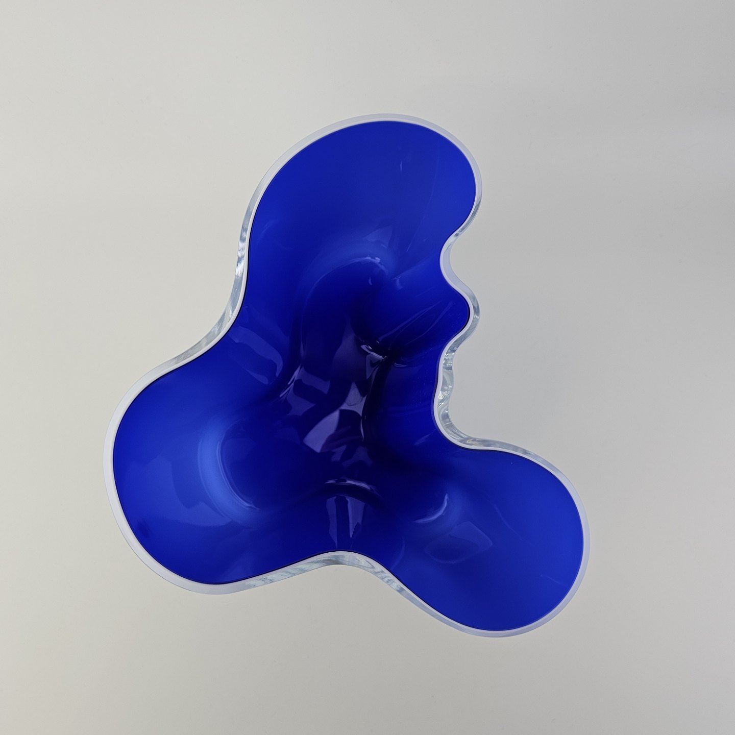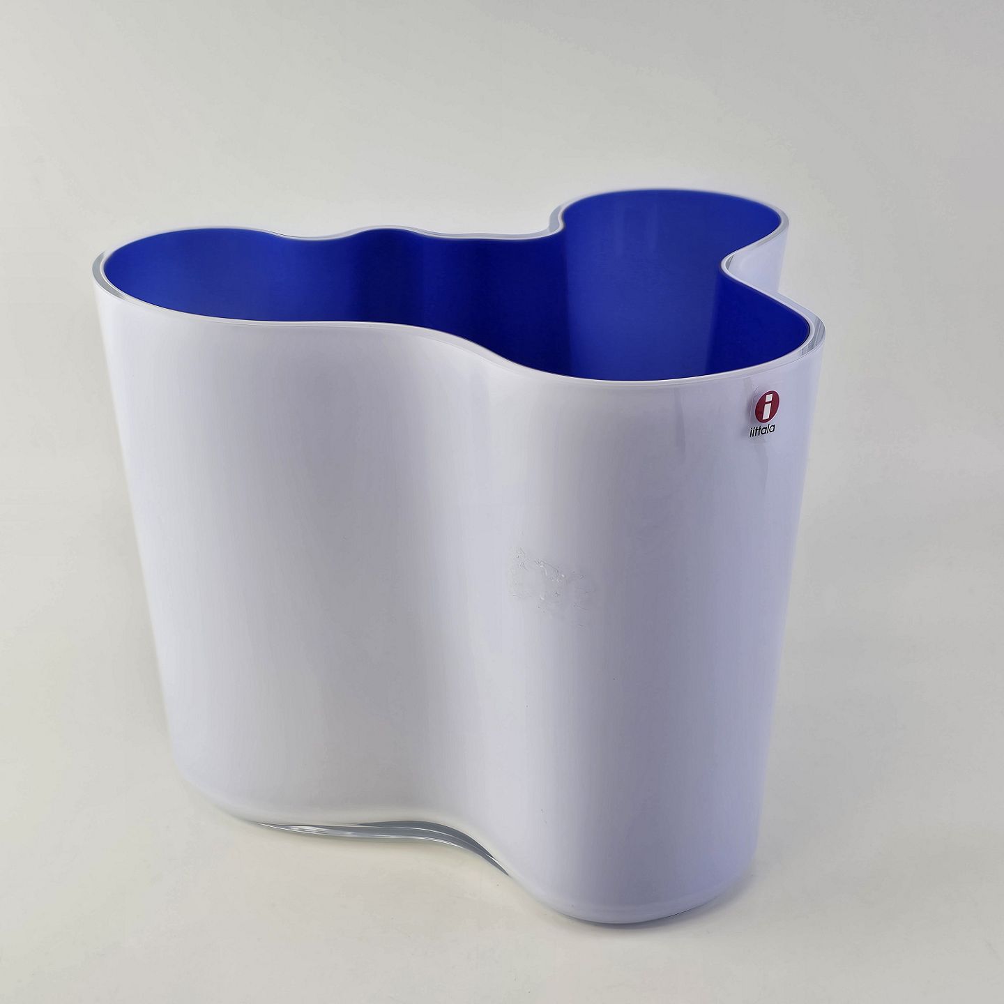 Savoy vase af glas, som er hvid på ydersiden og blå på indersidenFormgiver Alvar Aalto
