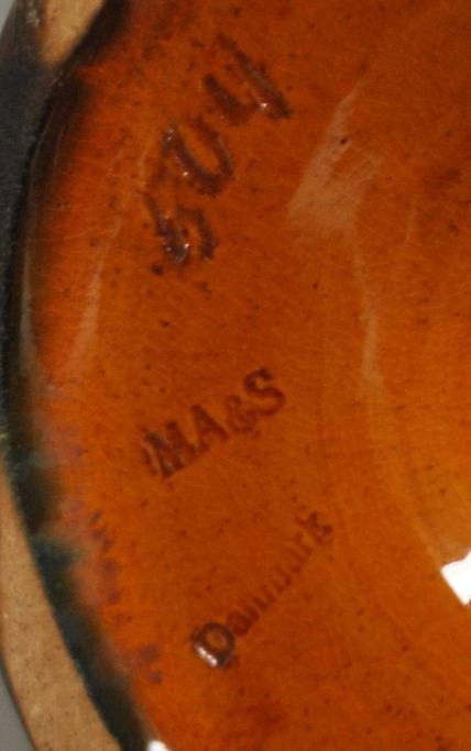 Keramik-Tischaufsatz Nr. 504 von Michael Andersen & Søn, 20. Jahrhundert. Bornholm, Dänemark. Glasur in Gelb, Braun, Orange und Grün. Gestempelt: MA&S Denmark. Höhe: 20 cm. Durchmesser: 27 cm.Bestellnummer: 29055