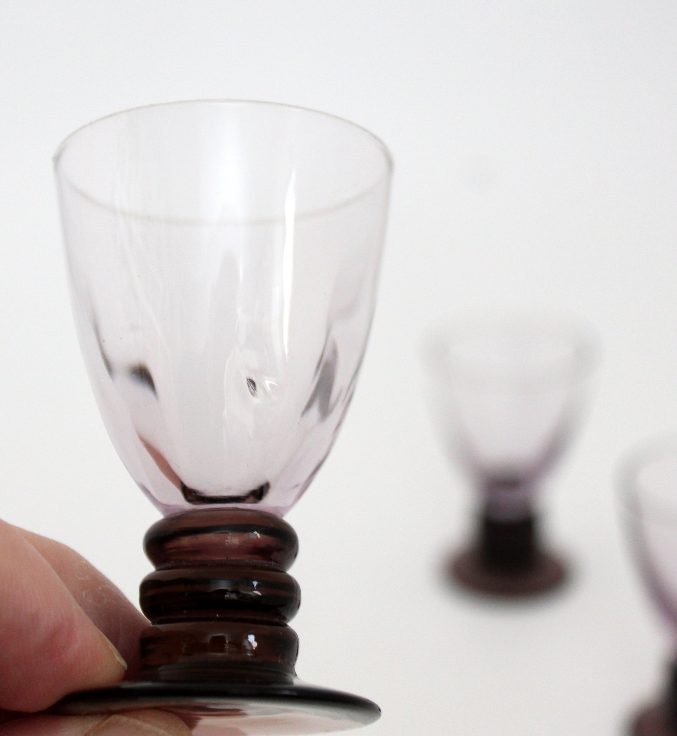 Holmegaard, Aalholm. Snapseglas, optisk stribet lilla kumme og sort fod. Designet af Jacob E Bang. Højde 7 cm. Øverste diameter 4,5 cm. Produktionsfejl på det ene af glassene, se foto. Pris: 250 kr. for sæt på 4 stk.