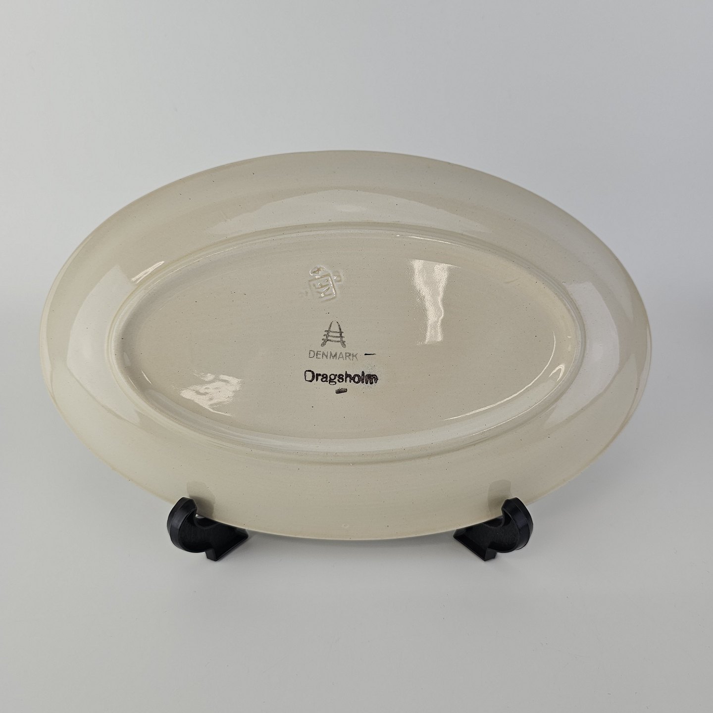 Ovalt fad i fajance fra stellet Dragsholm fremstillet i perioden 1934-1965. Formgiver Thorkild Olsen