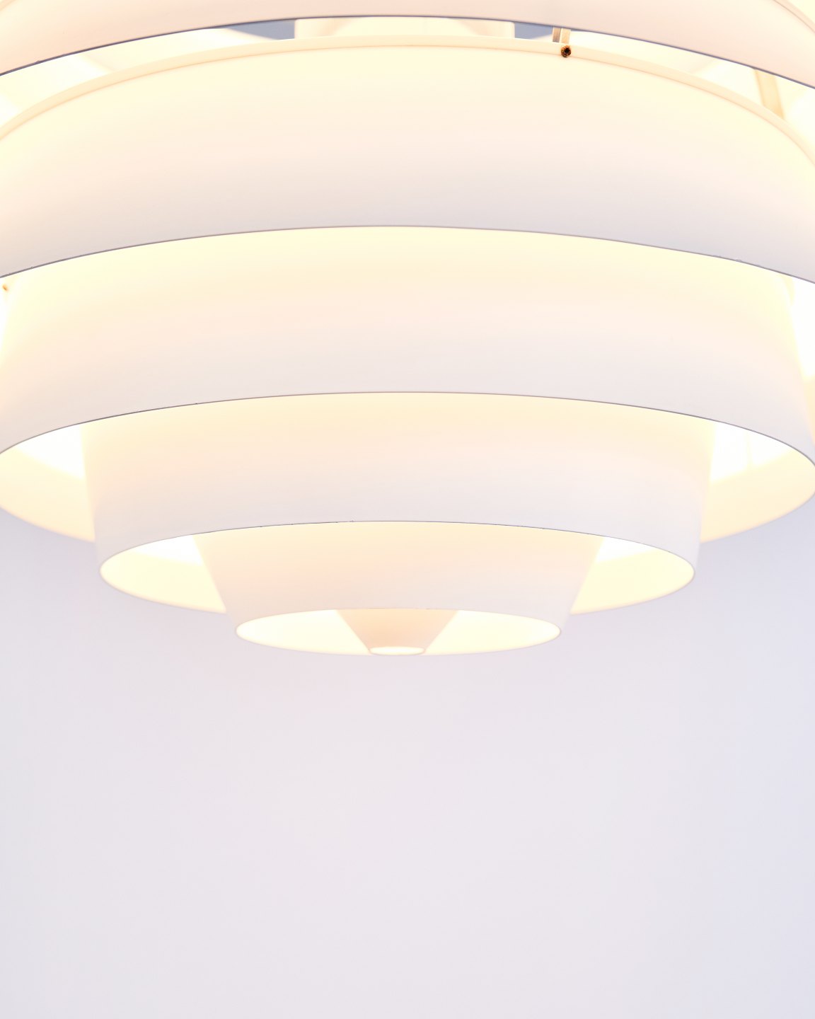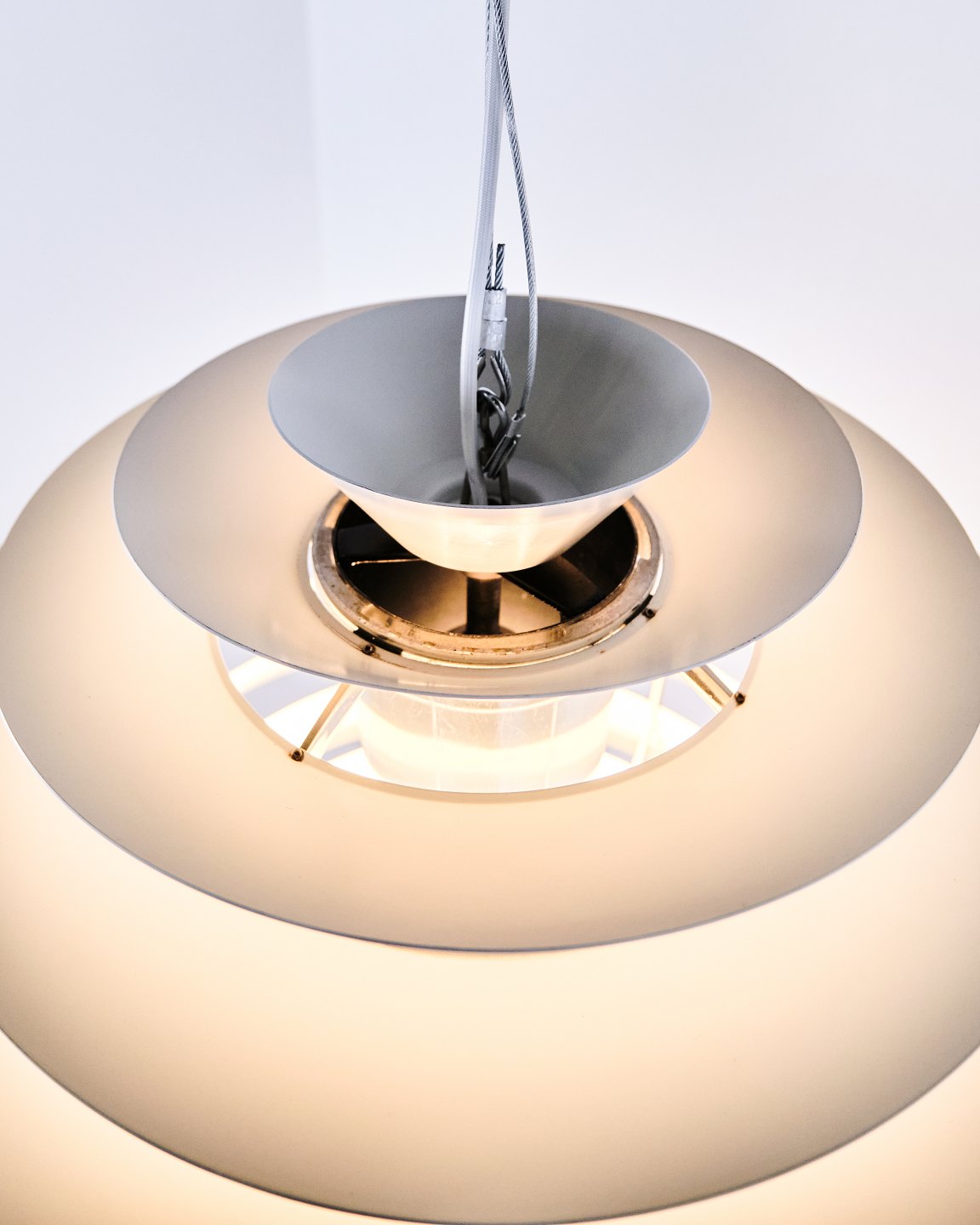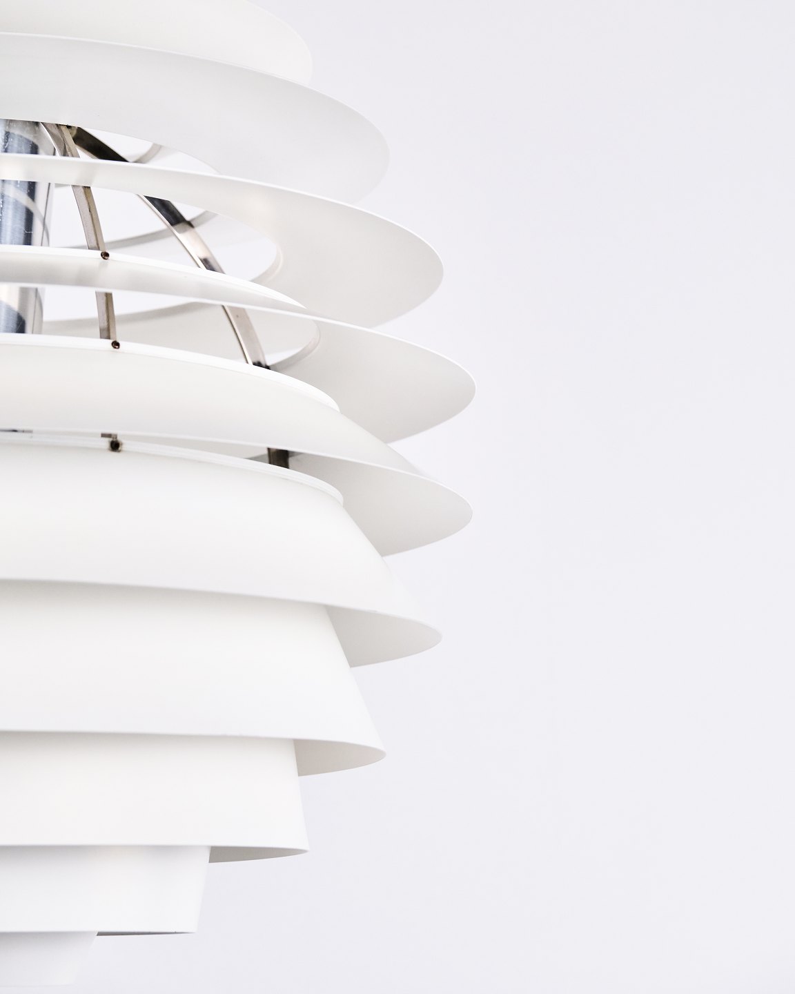 Ikonische Pendelleuchte, PH Louvre (früher PH Kugle genannt), entworfen von Poul Henningsen im Jahr 1957 für die Adventistenkirche in Skodsborg. Die Leuchte besteht aus 13 Lamellen, die auf einer inneren Konstruktion montiert sind und ein weiches und blendfreies Licht gewährleisten. Das kugelförmige Design sorgt für eine gleichmäßige Lichtverteilung und einen skulpturalen Ausdruck.PH Louvre ist eine Weiterentwicklung von Henningsens früheren Arbeiten, darunter Spiralen aus dem Jahr 1942, und der Name bezieht sich auf die Lamellenstruktur, bei der das Licht elegant durch die Schirme gefiltert wird.