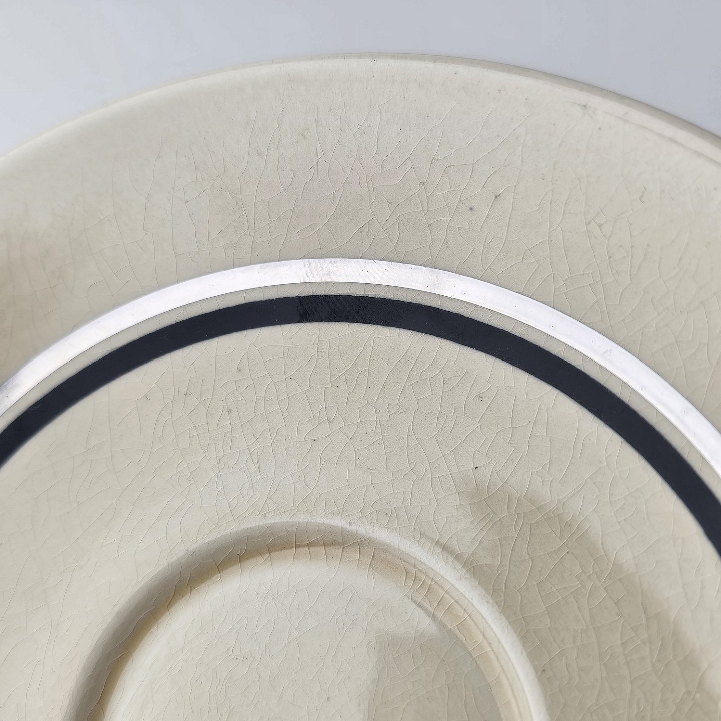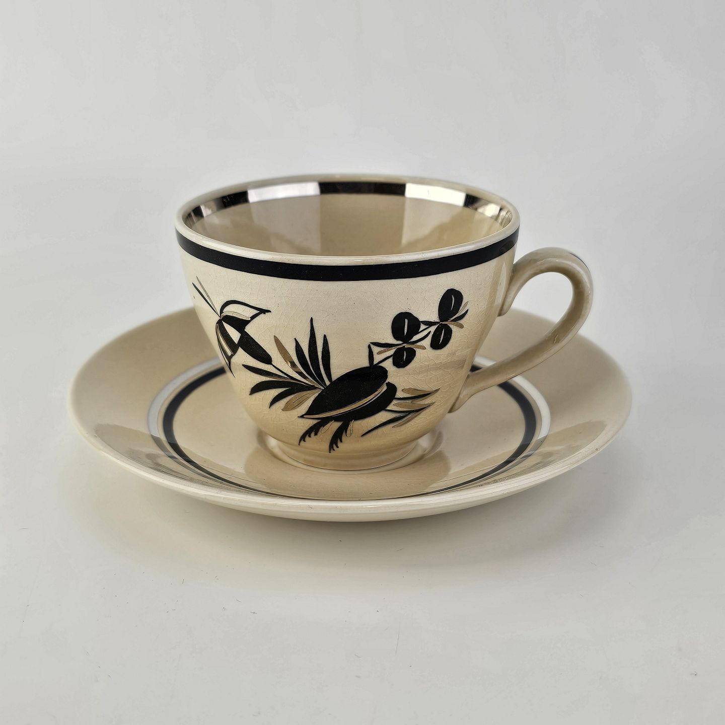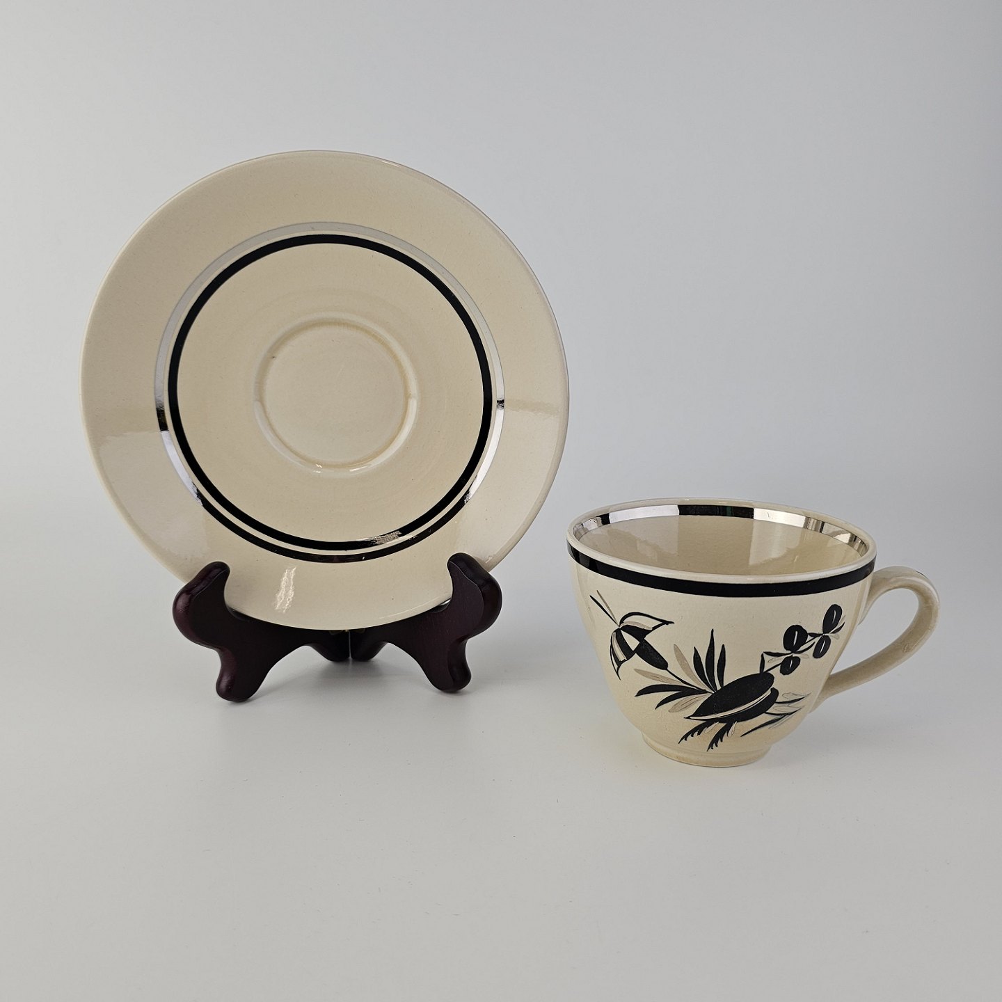 Råhvidt fajancestel i stelform E med dekoration af naturmotiver i sølv og sort farve.
