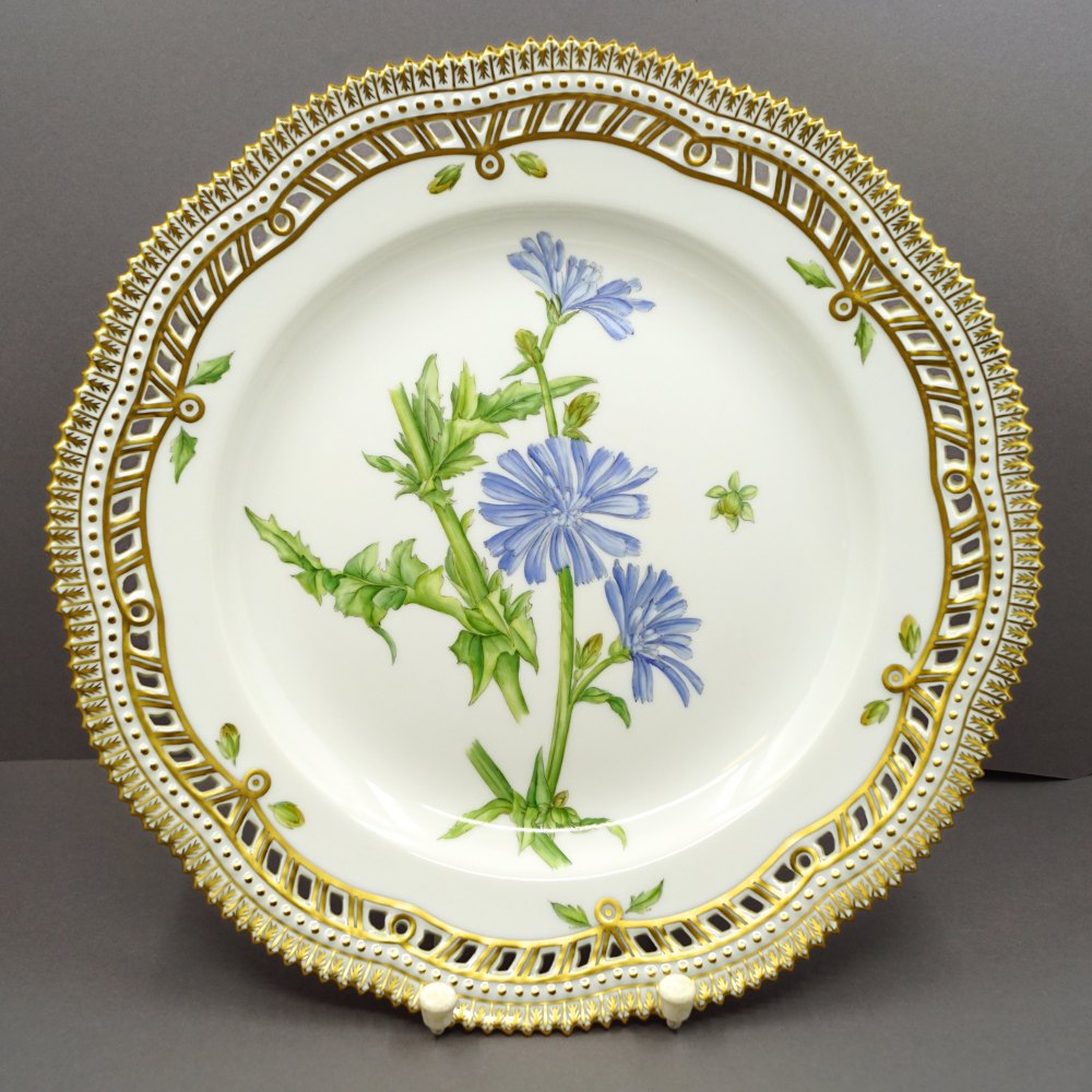 Royal Copenhagen, Flora Danica porcelæn; Middagstallerken #3553/3535 med gennembrudt kant.Dekoration: Cichorium intybus L (Cikorie). Dekoreret i farver og guld med blomster.