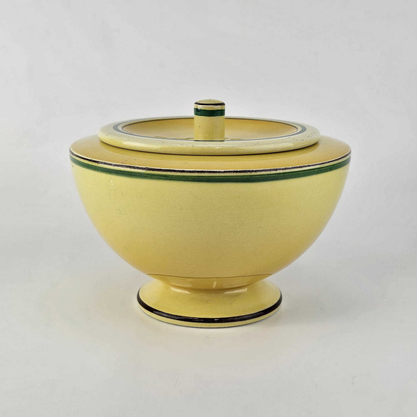 Fajancestel i stelform C med dekoration i gule nuancer med grøn stribe.
