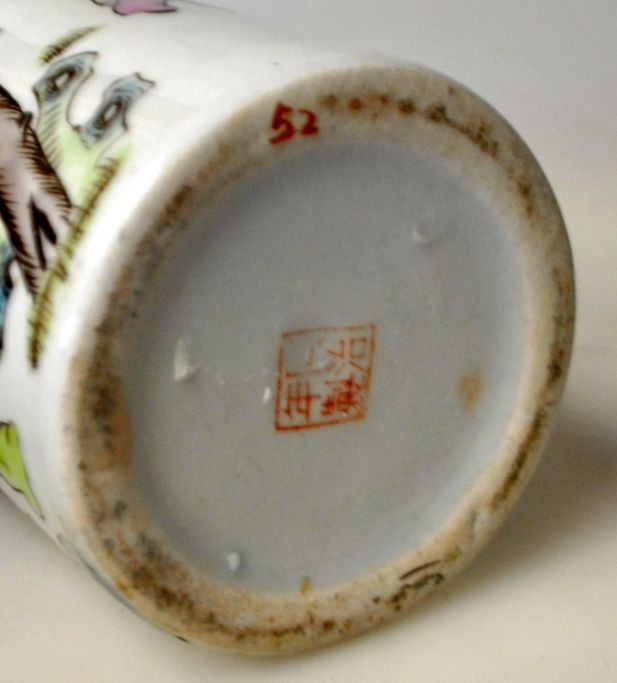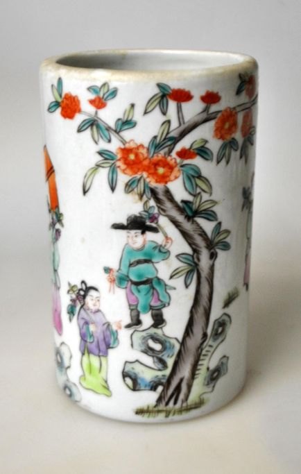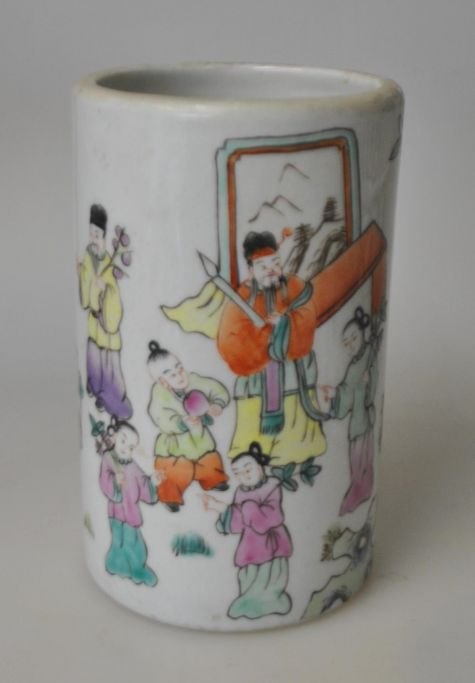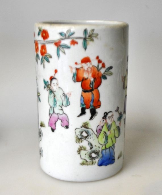 Chinesischer Porzellan-Pinselbecher, 19./20. Jahrhundert. Handbemalt mit zahlreichen Figuren. Gestempelt. Höhe: 13 cm.Bestellnummer: 29070