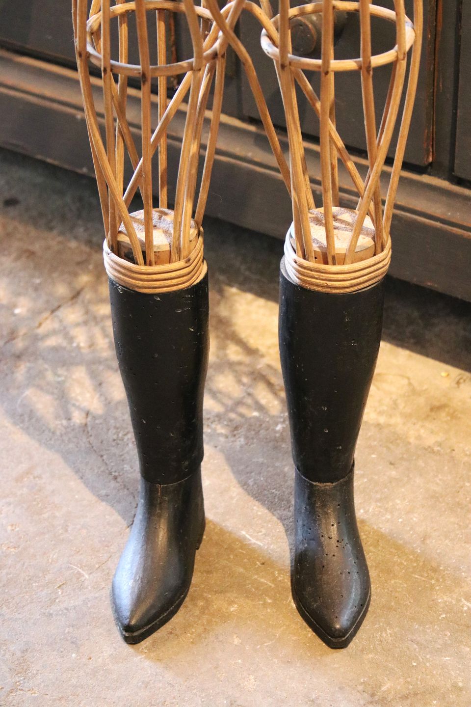 Dekorativ , gammel fransk Napoleon d.III. mannequin gine i flettet rattan med sorte træ støvler og med en fin patina.