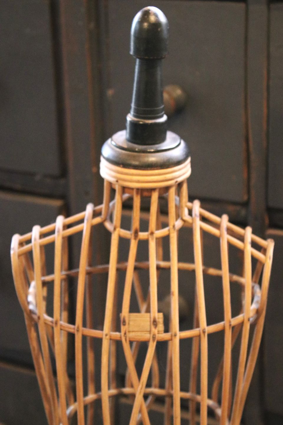 Dekorativ , gammel fransk Napoleon d.III. mannequin gine i flettet rattan med sorte træ støvler...