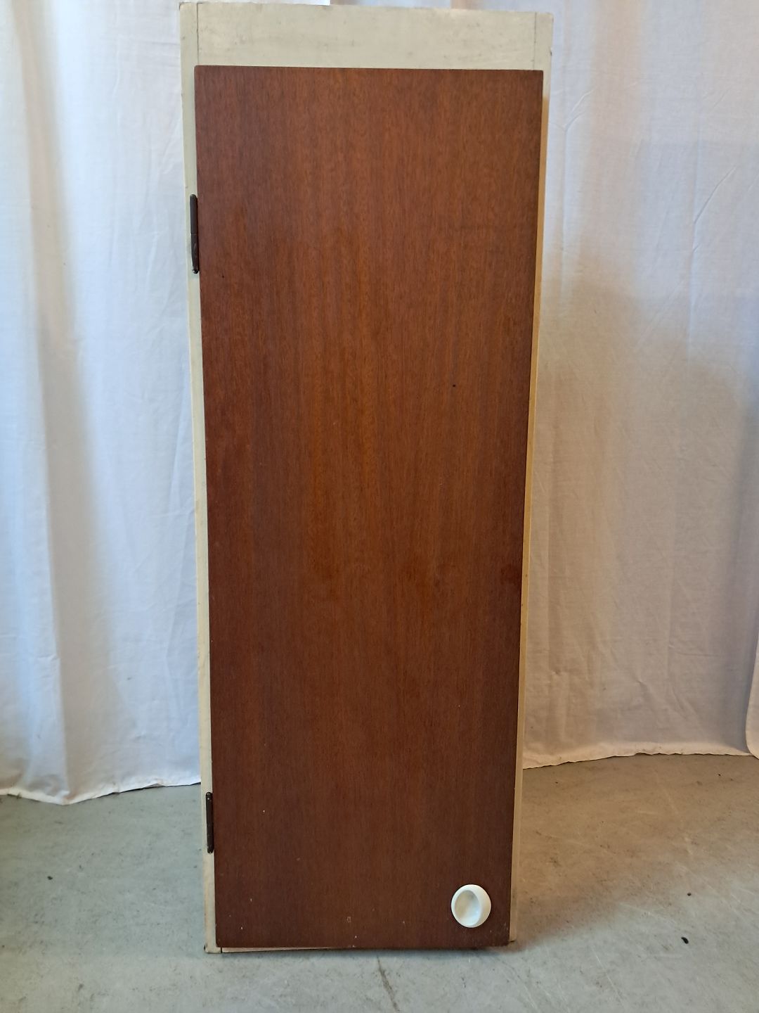 Gammelt malet køkkenskab med låge i fineret mahogni, fra 1950erne.Det trænger til at blive peppet op.