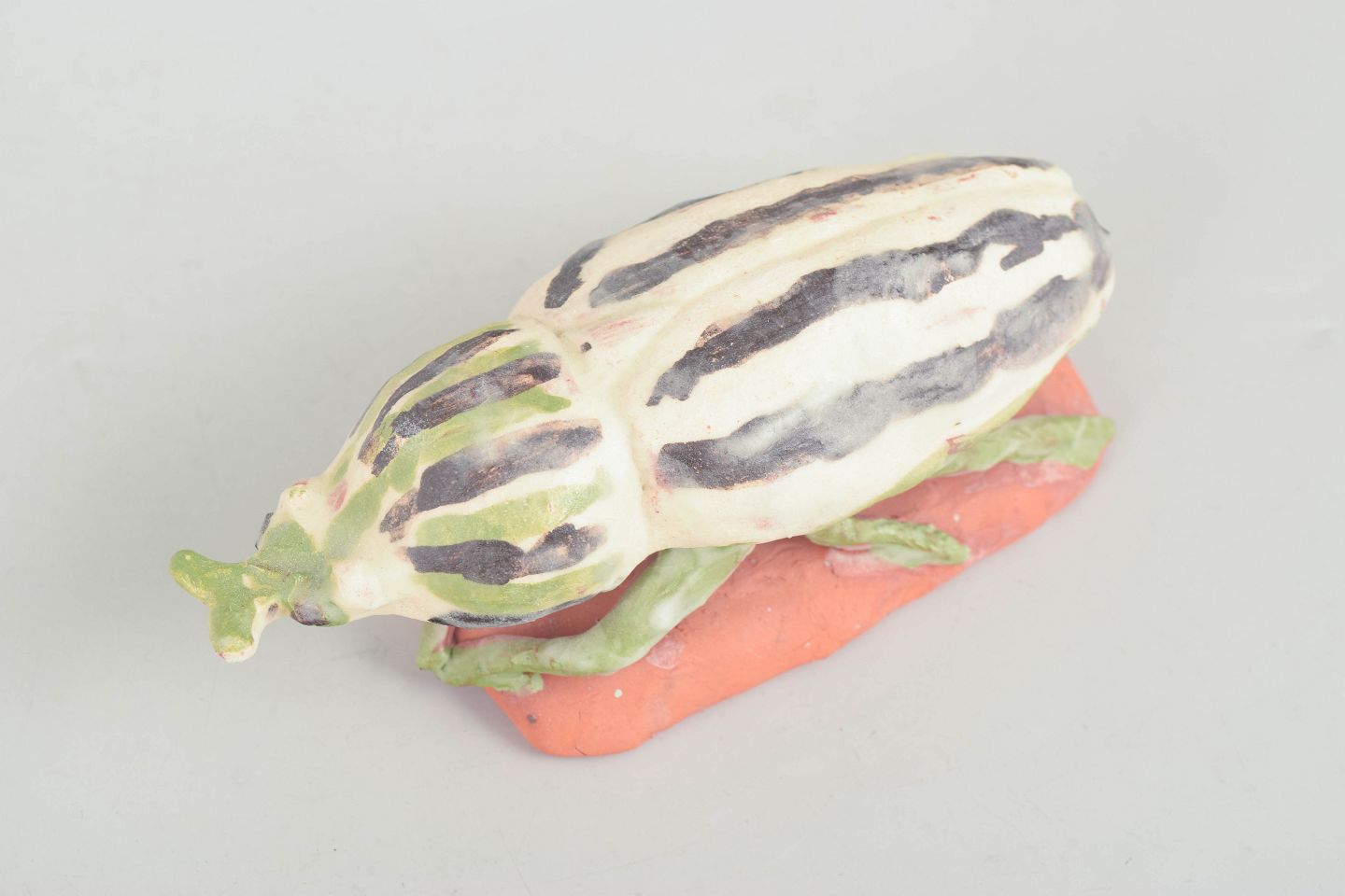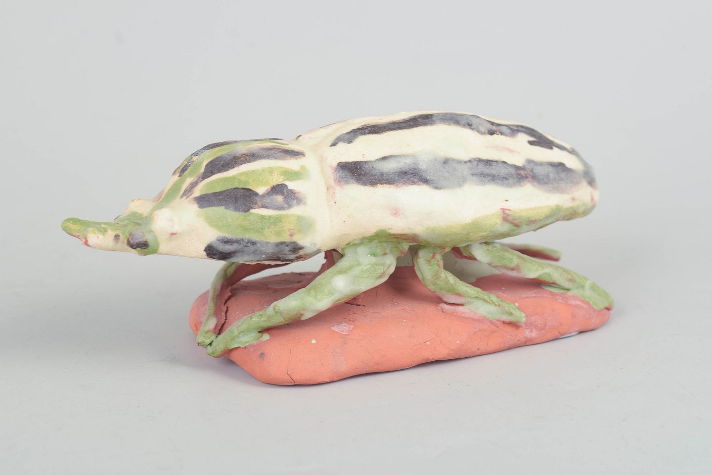 Nils-Erik Zetterström, insekt figur.Unik keramisk figur forestillende et insekt udført i stentøj med lys glasur dekoreret med grønne og mørke nuancer. Figuren er modelleret med en stiliseret, naturalistisk form og placeret på en lille base i ler, hvilket giver et skulpturelt og levende udtryk. Usigneret unika fra 1970’erne.