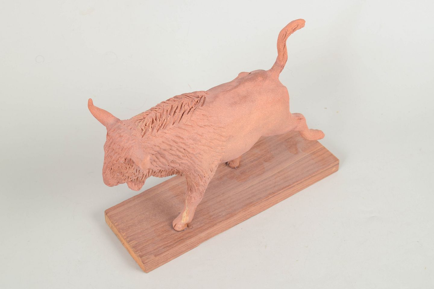 Nils-Erik Zetterström, tyre figur på træbase.Unik keramisk figur forestillende en tyr udført i uglaseret ler monteret på en rektangulær træbase. Figuren er modelleret i en dynamisk bevægelse med løftet ben og detaljeret pelsstruktur, hvilket giver et kraftfuldt og skulpturelt udtryk. Usigneret unika fra 1970’erne.