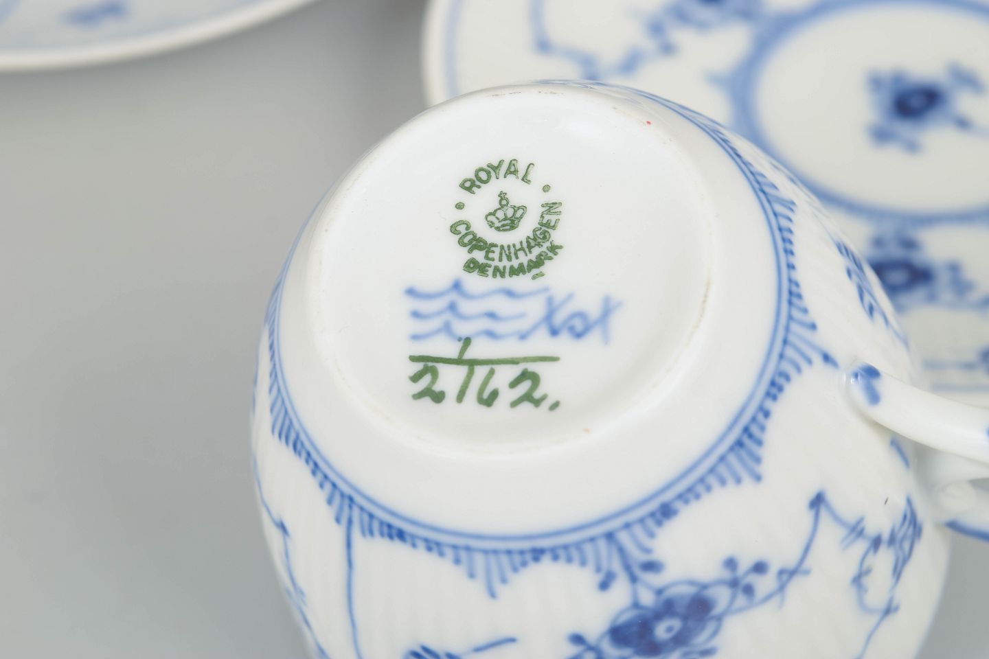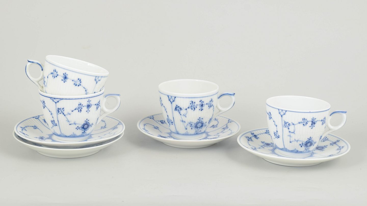 Royal Copenhagen Musselmalet Riflet, sæt af fire kaffekopper med underkopper.