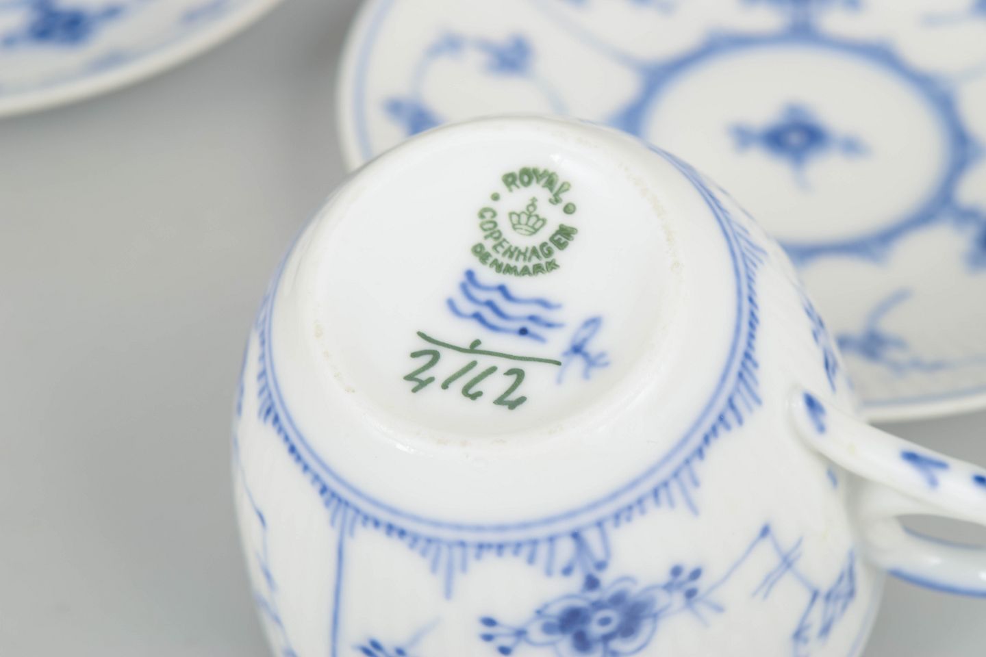 Royal Copenhagen Musselmalet Riflet, sæt af fire kaffekopper med underkopper.