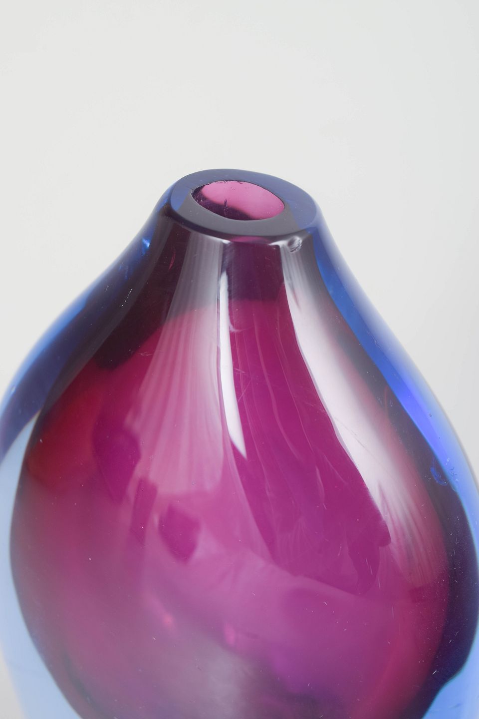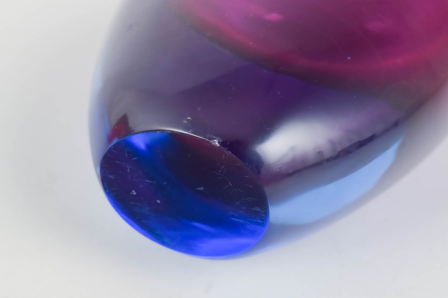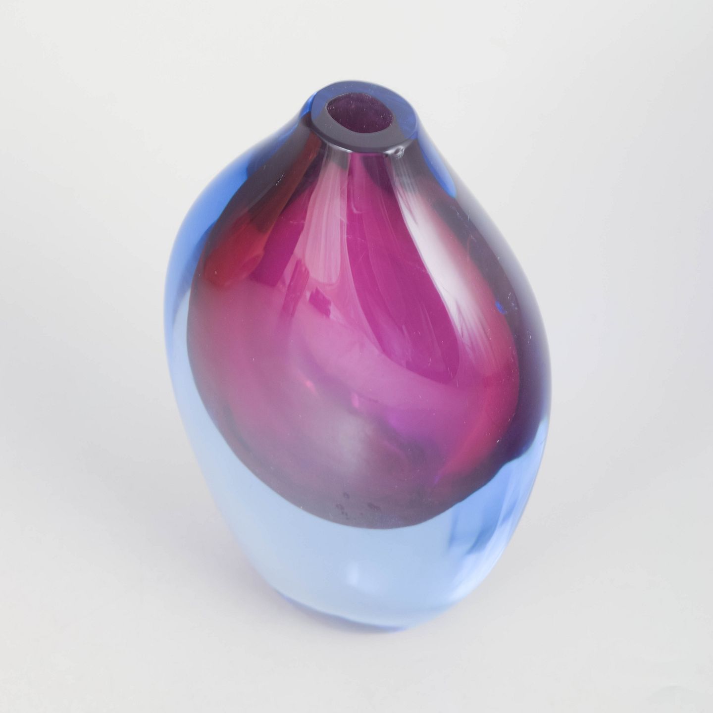 Murano, vase.Dekorativ kunstglasvase i klart blåt glas med indkapslet rosa kerne og blød organisk form, udført i karakteristisk Murano-stil med lagdelt glas.
