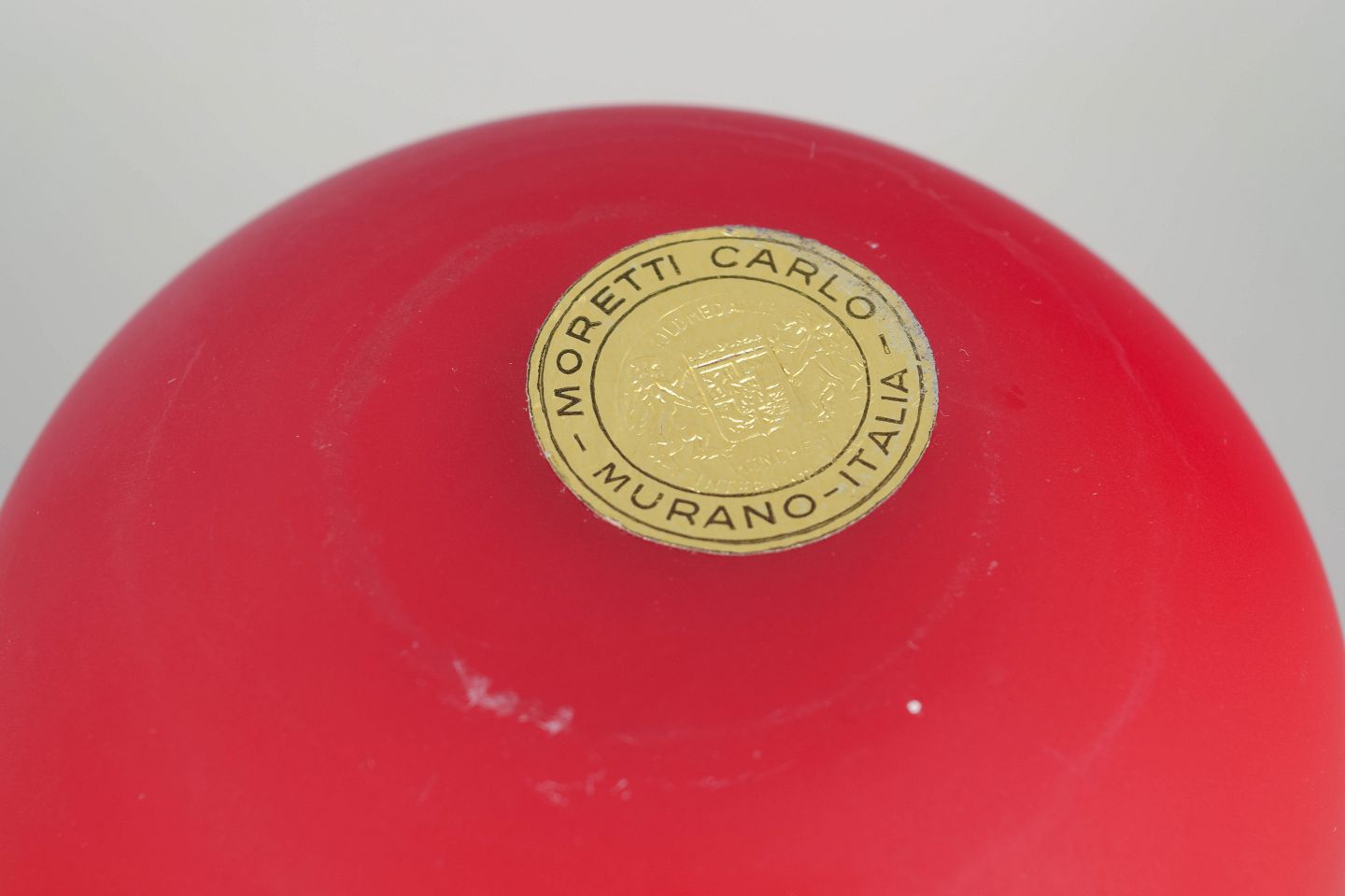 Carlo Moretti, Murano, vase.Kompakt kunstglasvase i matteret rødt glas med rund kugleformet krop og cylindrisk hals. Original mærkat “Moretti Carlo – Murano Italia”.