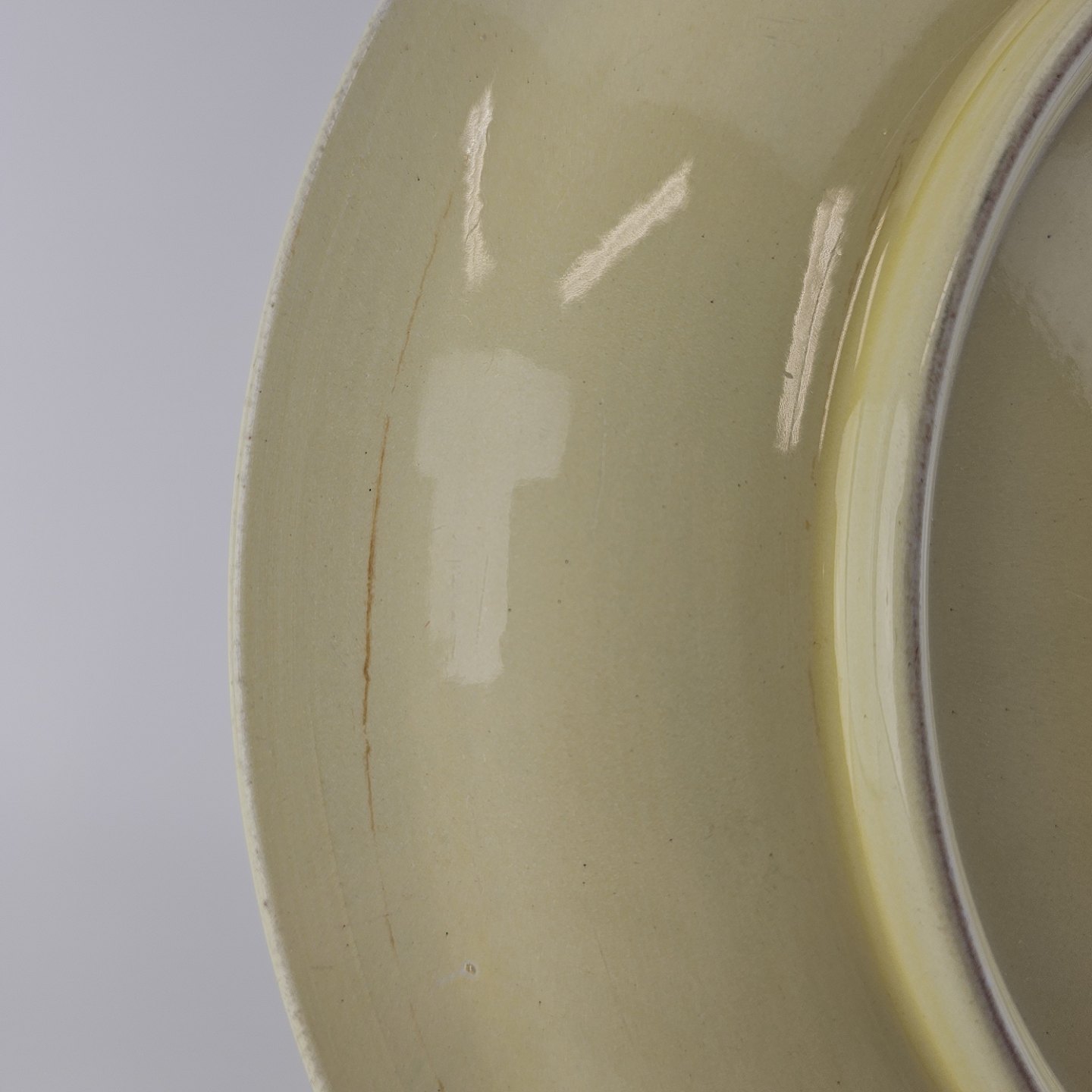 Fajancestel i stelform C med dekoration i gule nuancer med grøn stribe.