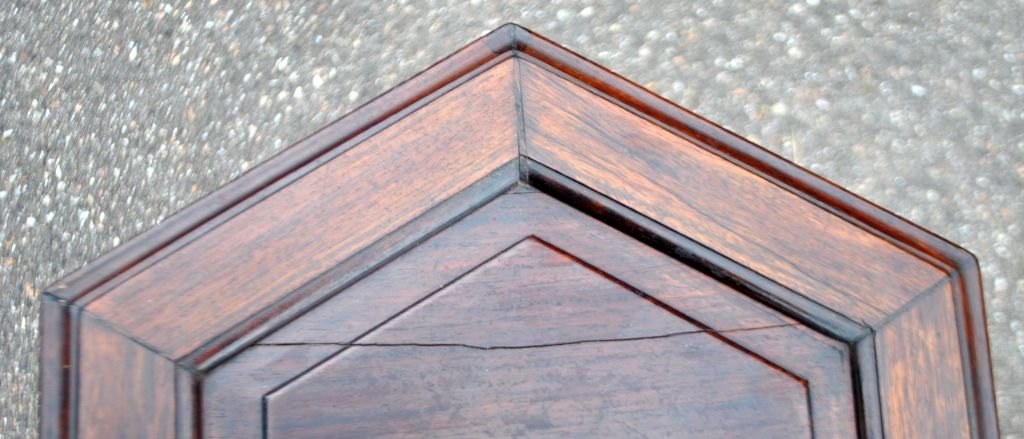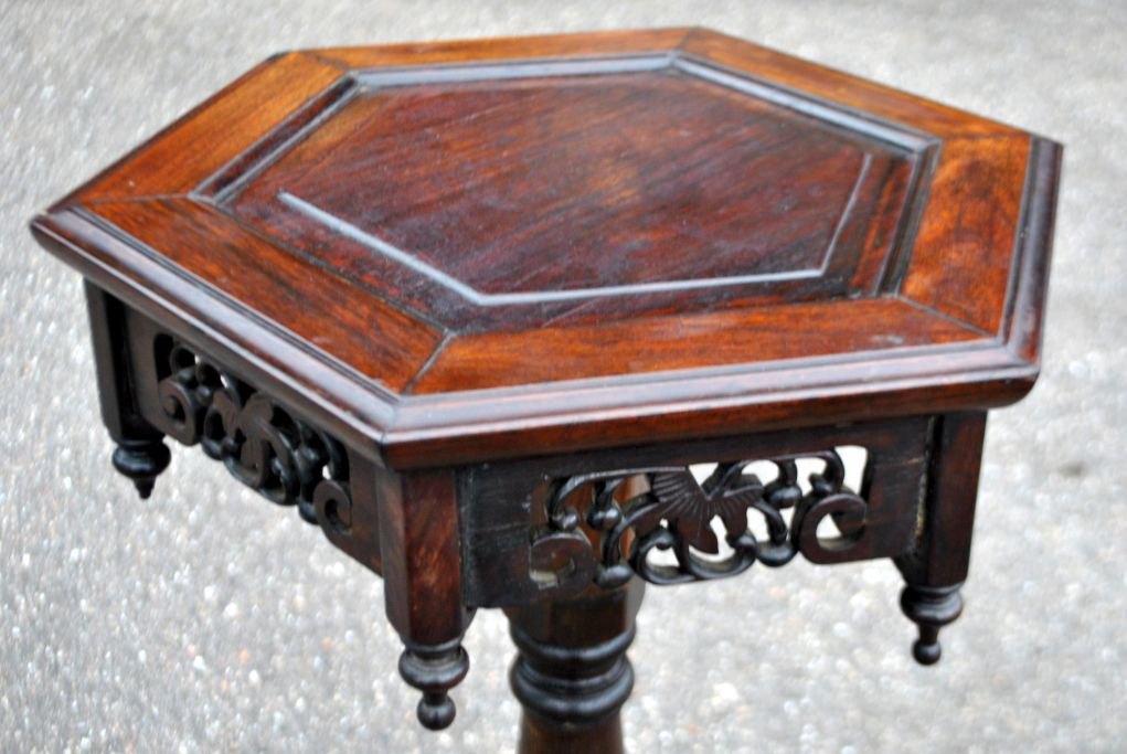 Sechseckiger Beistelltisch, 19. Jahrhundert. China. Mahagoni. Dreibeinig mit Schnitzereien. Höhe: 58,5 cm. Breite: 39 cm.Bestellnummer: 29077