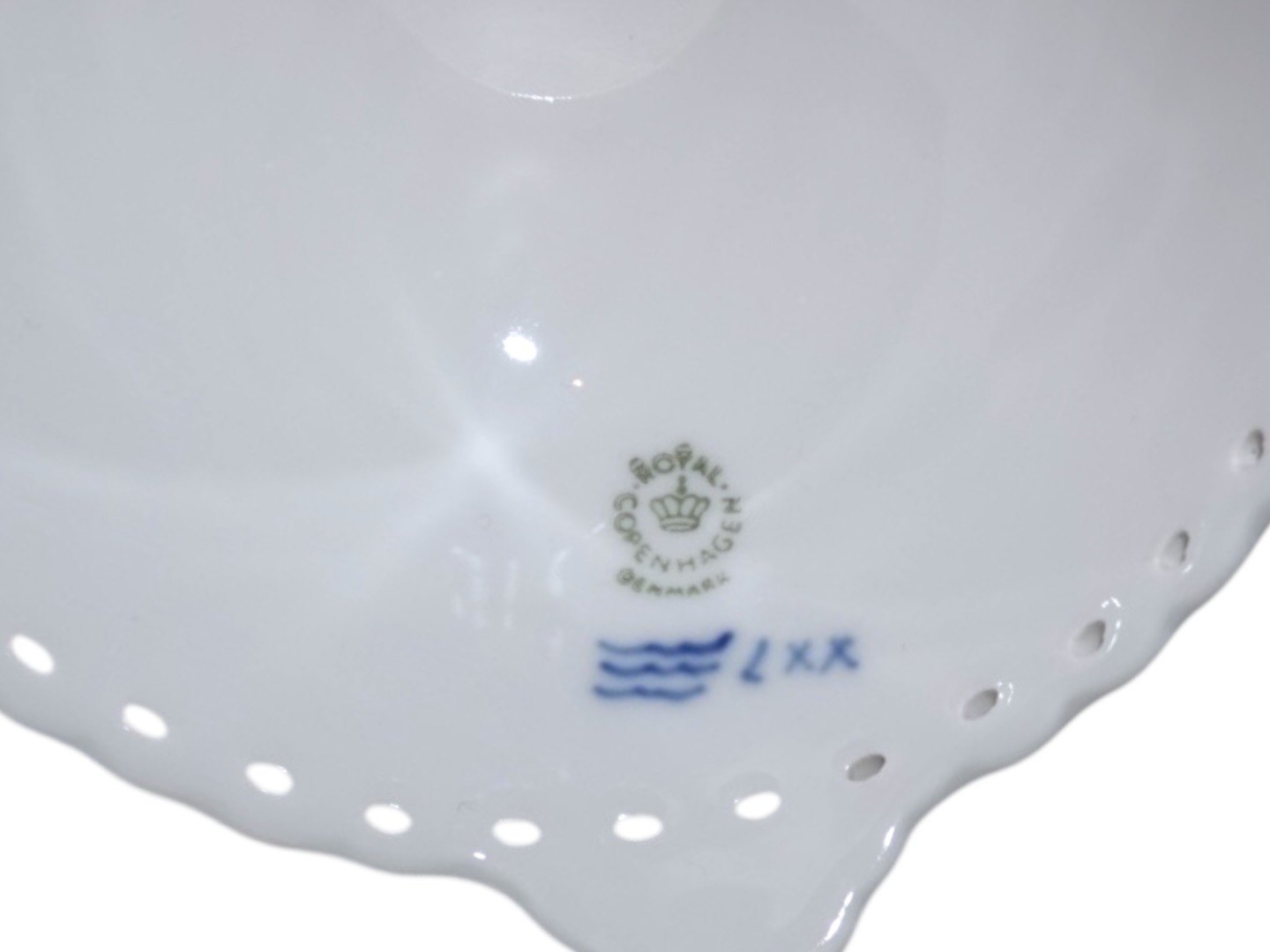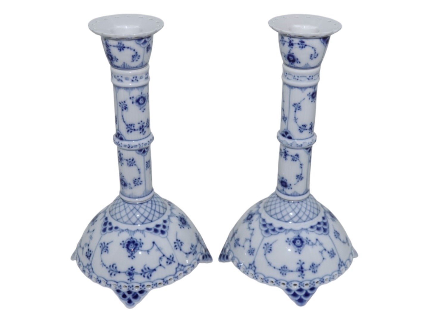 Royal Copenhagen Musselmalet Helblonde, to høje lysestager.Af fabriksmærket kan det udledes, at disse er produceret mellem 1992 og 1999.