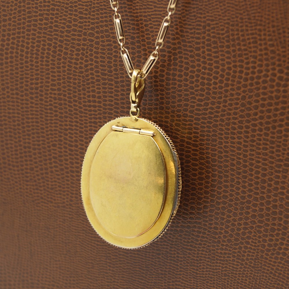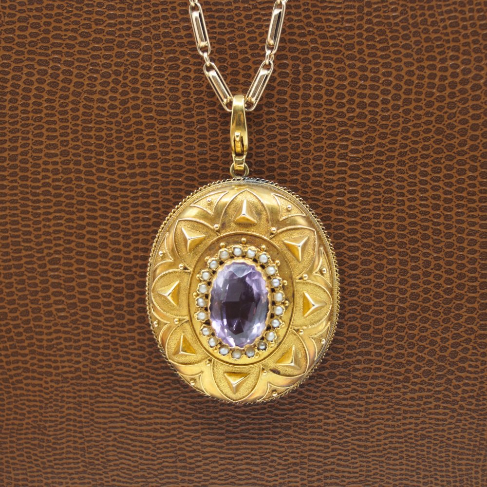 Medaljon i 14 kt. guld med ametyst, omkranset af små perler.Kan åbnes bagtil.