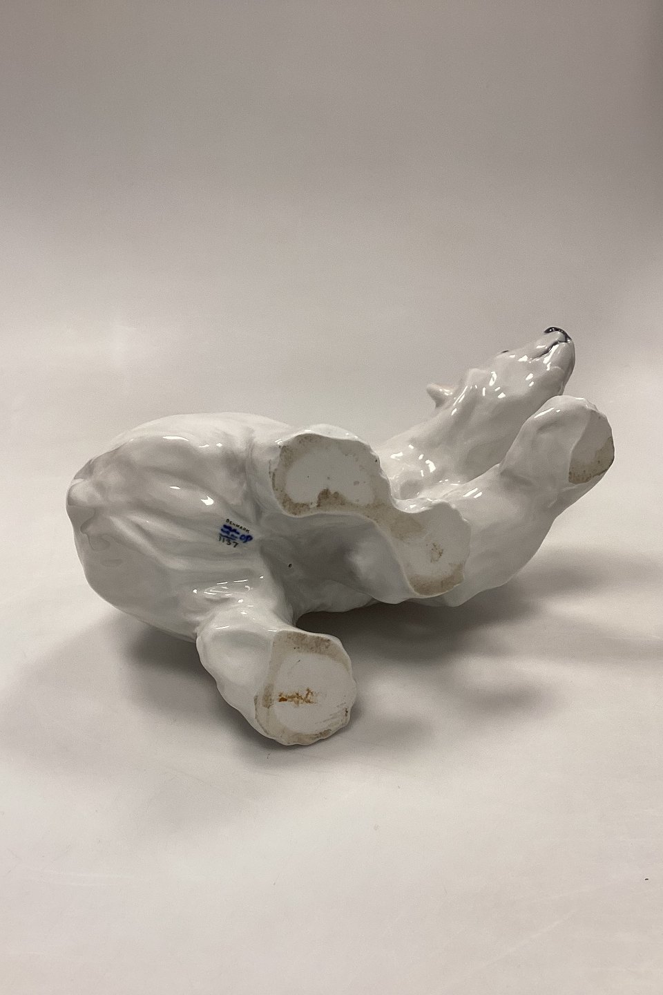 Royal Copenhagen Figur af Isbjørn No. 1137. Designet af Knud Kyhn. Måler 27 cm x 17 cm / 10,63 in. x 6,69 in. 2. Sortering med lille sort nist på ryggen, se foto.