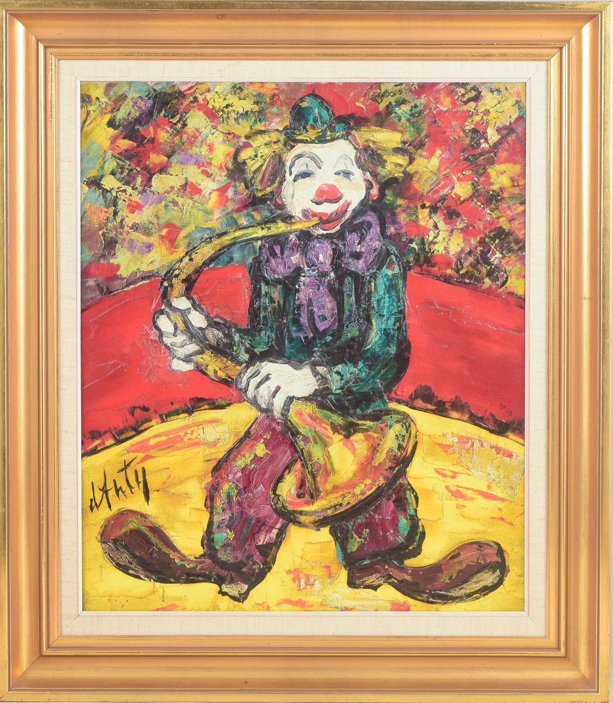 Henry d’Anty, oliemaleri på lærred, fransk kunstner.Farverig figurativ komposition med klovn, der spiller saxofon, udført i kraftige ekspressive penselstrøg og en intens palet domineret af røde, gule og grønne toner. Maleriet er signeret nederst og udført i kunstnerens karakteristiske stil med tykke lag maling og markerede konturer.