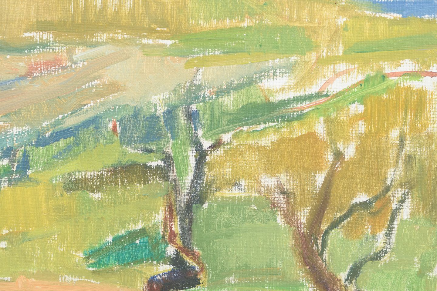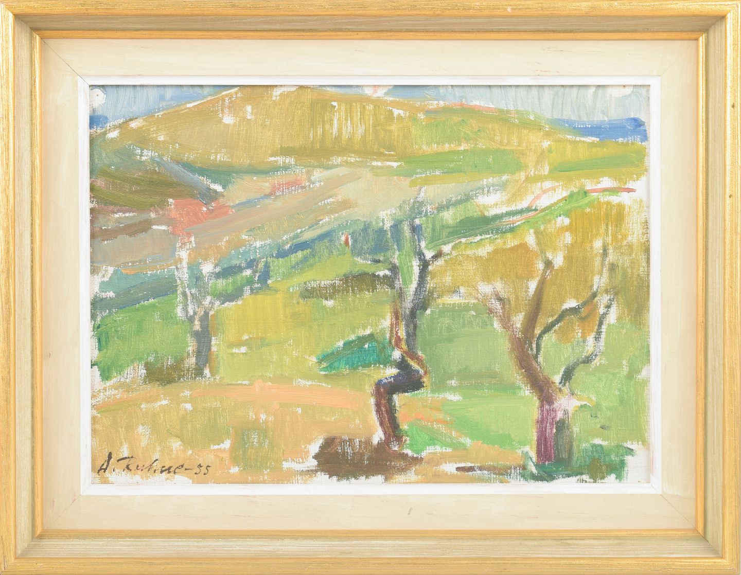 Dorothy Ruhne-Sempinski, oliemaleri på lærred, svensk billedkunstner.Modernistisk landskabsmotiv udført i brede, ekspressive penselstrøg med let abstraherede træformer og farveflader i grønne, gule og jordfarvede toner. Signeret og dateret 1955.