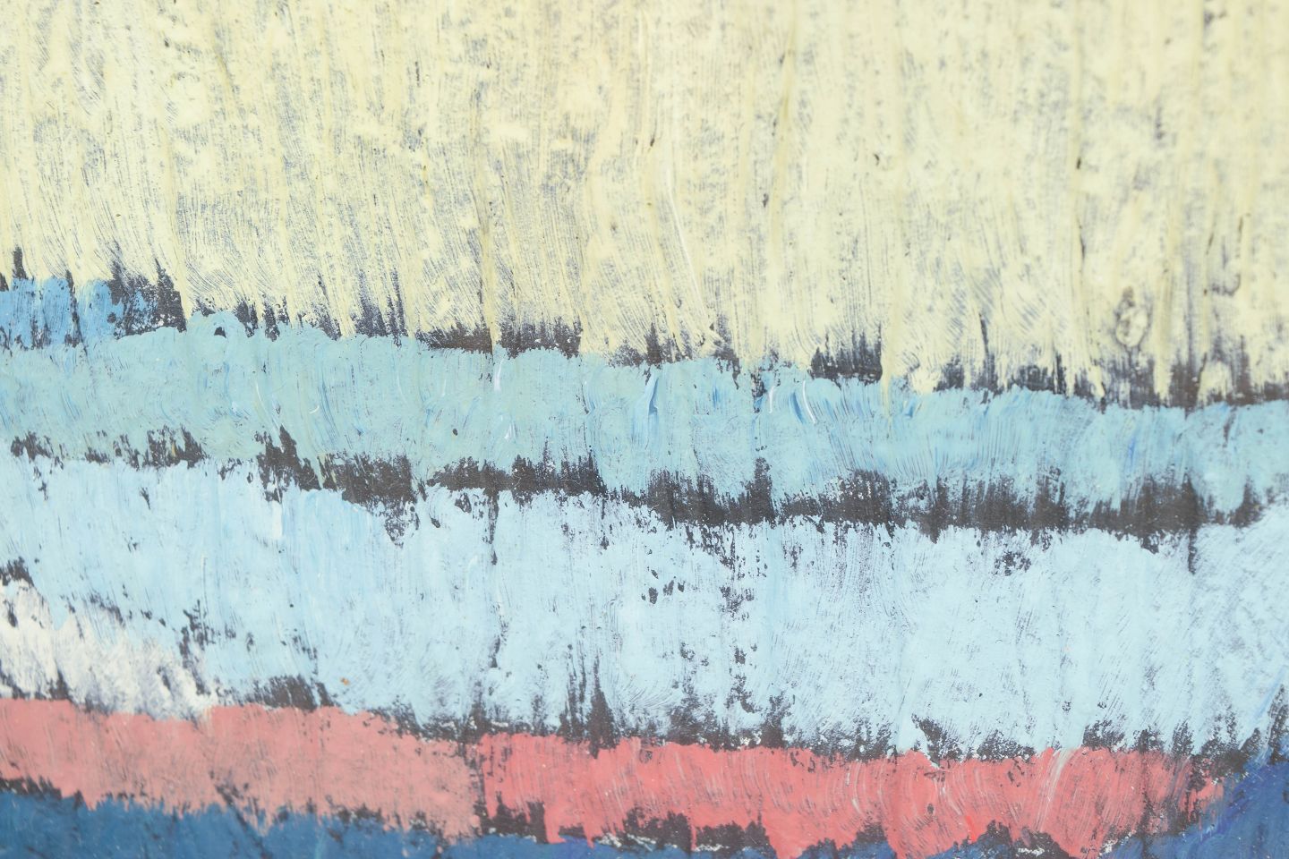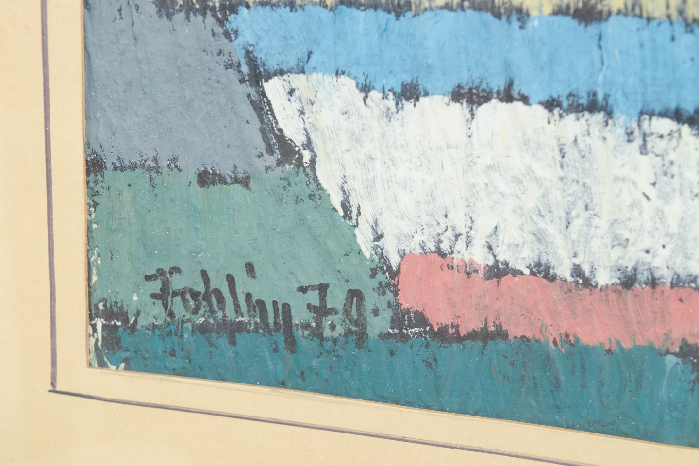 Gunnar Fohlin, oliemaleri på papir, svensk kunstner.Abstrakt landskabskomposition udført i olie på papir med brede, strukturerede penselstrøg i blå, hvide og grønne toner med et horisontalt bånd i rødligt nuance. Kompositionen har en tydelig horisontal opbygning, der giver associationer til hav og kystlandskab.