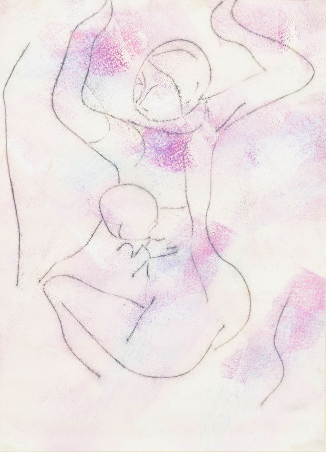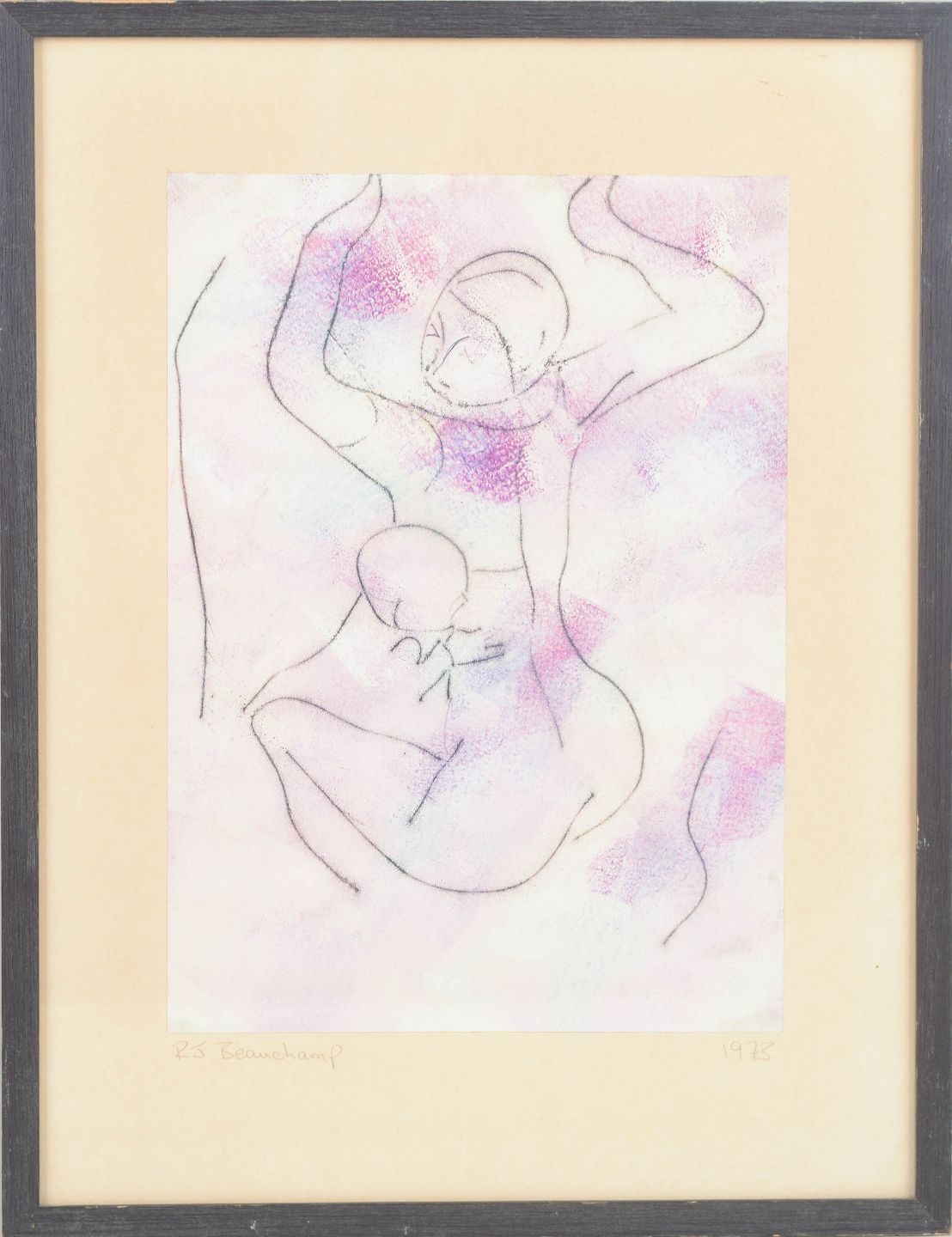 Robert Beauchamp, mixed media, amerikansk billedkunstner.Figurativ komposition med mor og barn udført i pastel på papir, dateret 1973. Motivet er tegnet med en fri og ekspressiv streg og bløde farvefelter i rosa og violette toner.