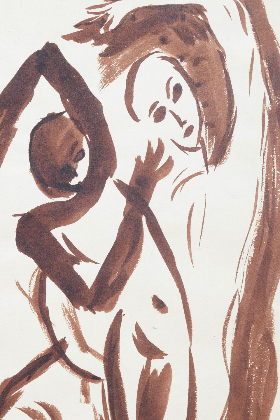 Eugène de Sala, tegning.Art deco figurtegning udført på papir med fri og ekspressiv penselstreg i brun tone. Kompositionen viser flere stiliserede menneskefigurer i bevægelse, gengivet med en dynamisk og rytmisk linjeføring karakteristisk for 1930’ernes avantgardistiske tegnekunst. Signeret i blyant nederst.