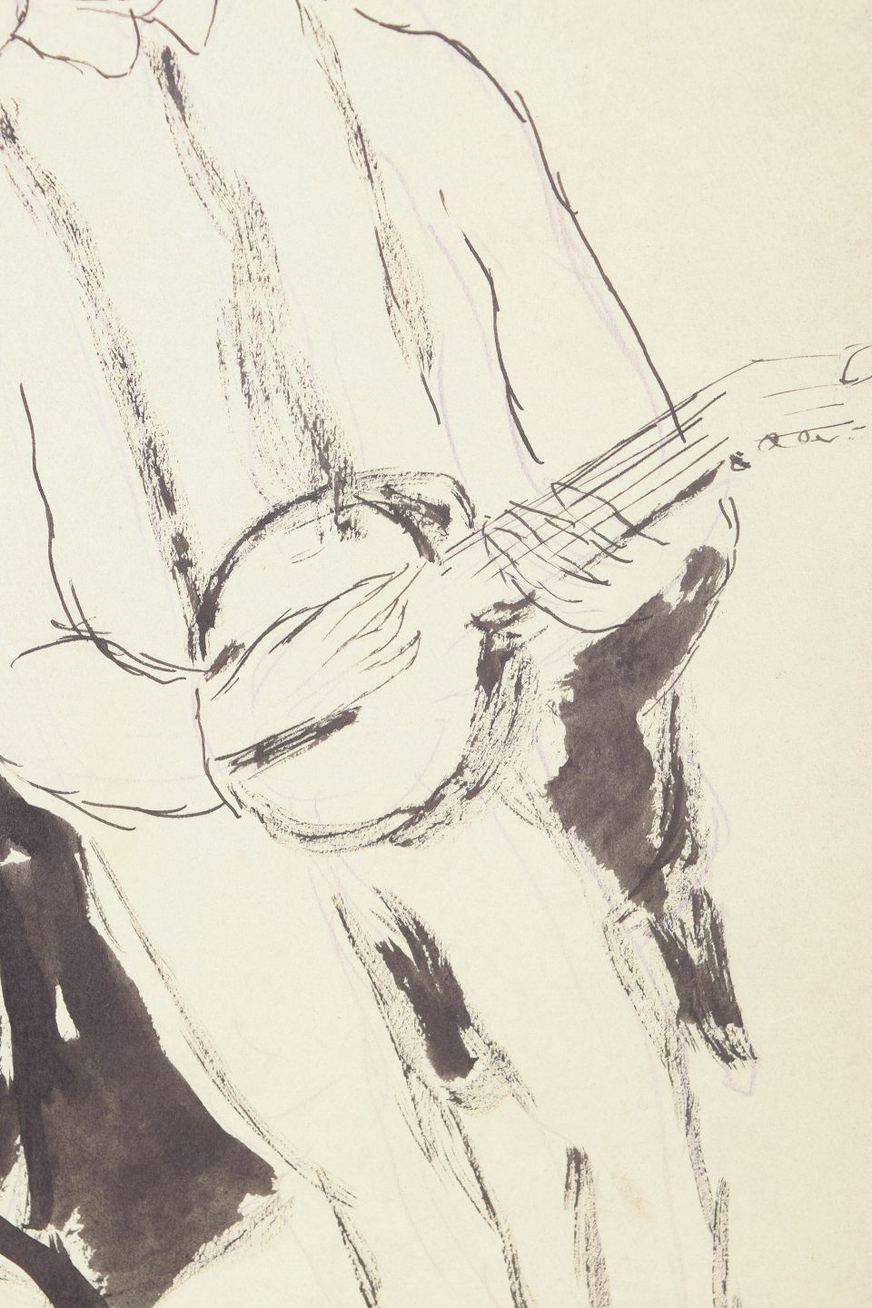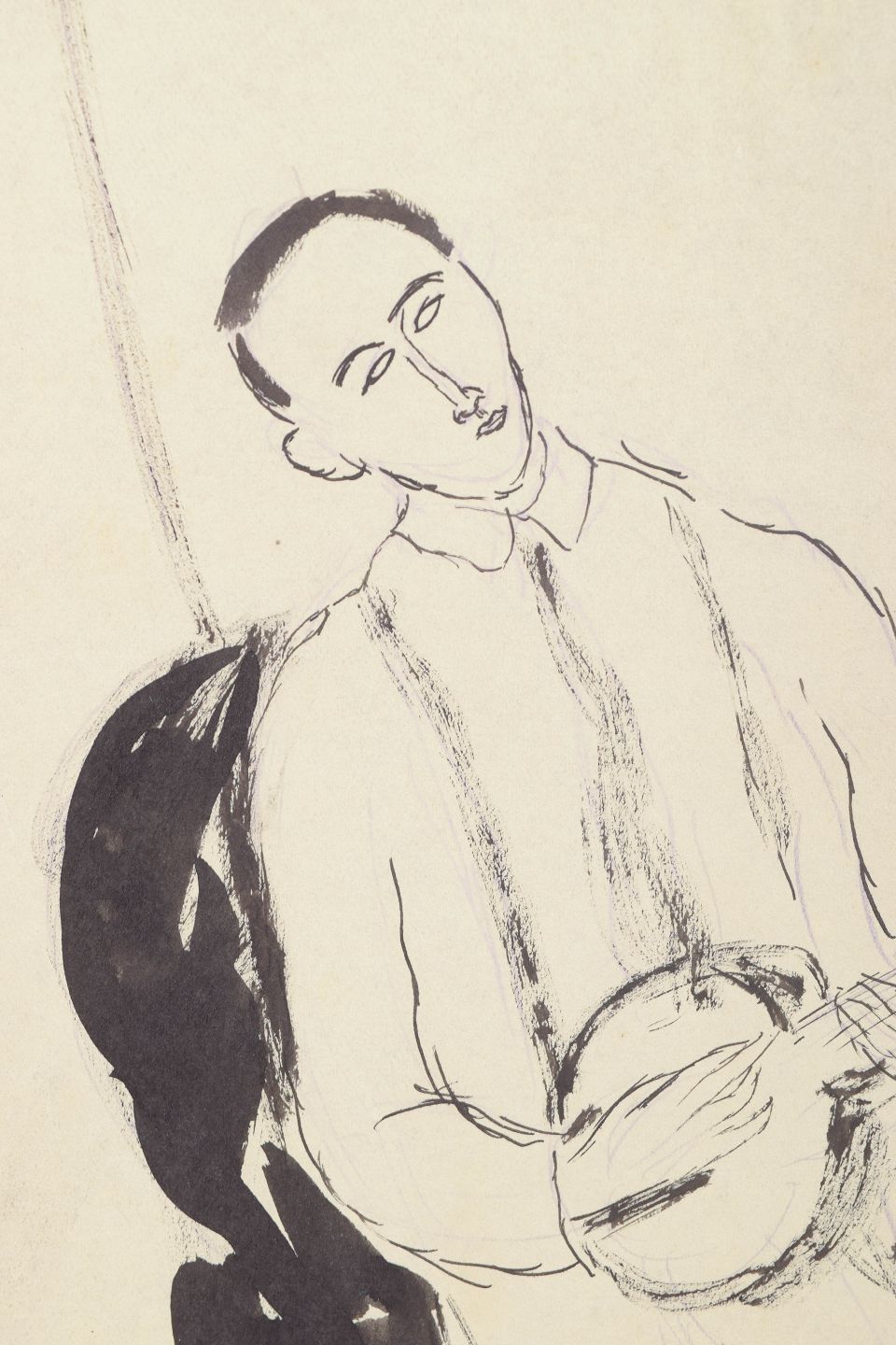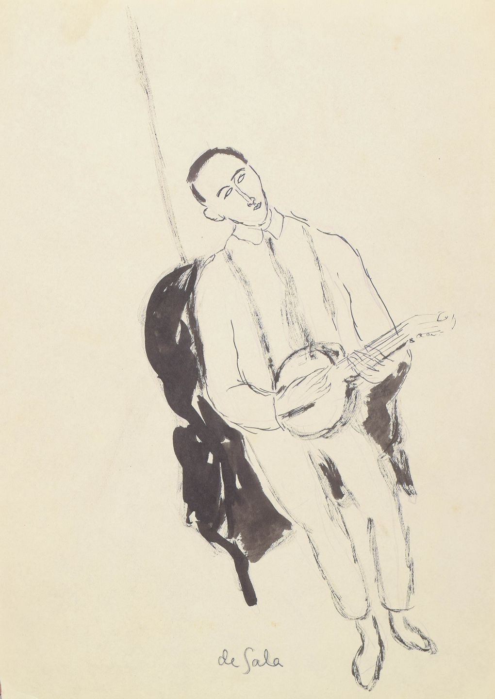 Eugene de Sala, tegning.Art deco figurtegning udført på papir med fri og ekspressiv streg. Motivet viser en siddende mandlig figur med strengeinstrument, gengivet med en enkel og rytmisk linjeføring typisk for 1930’ernes modernistiske illustration.