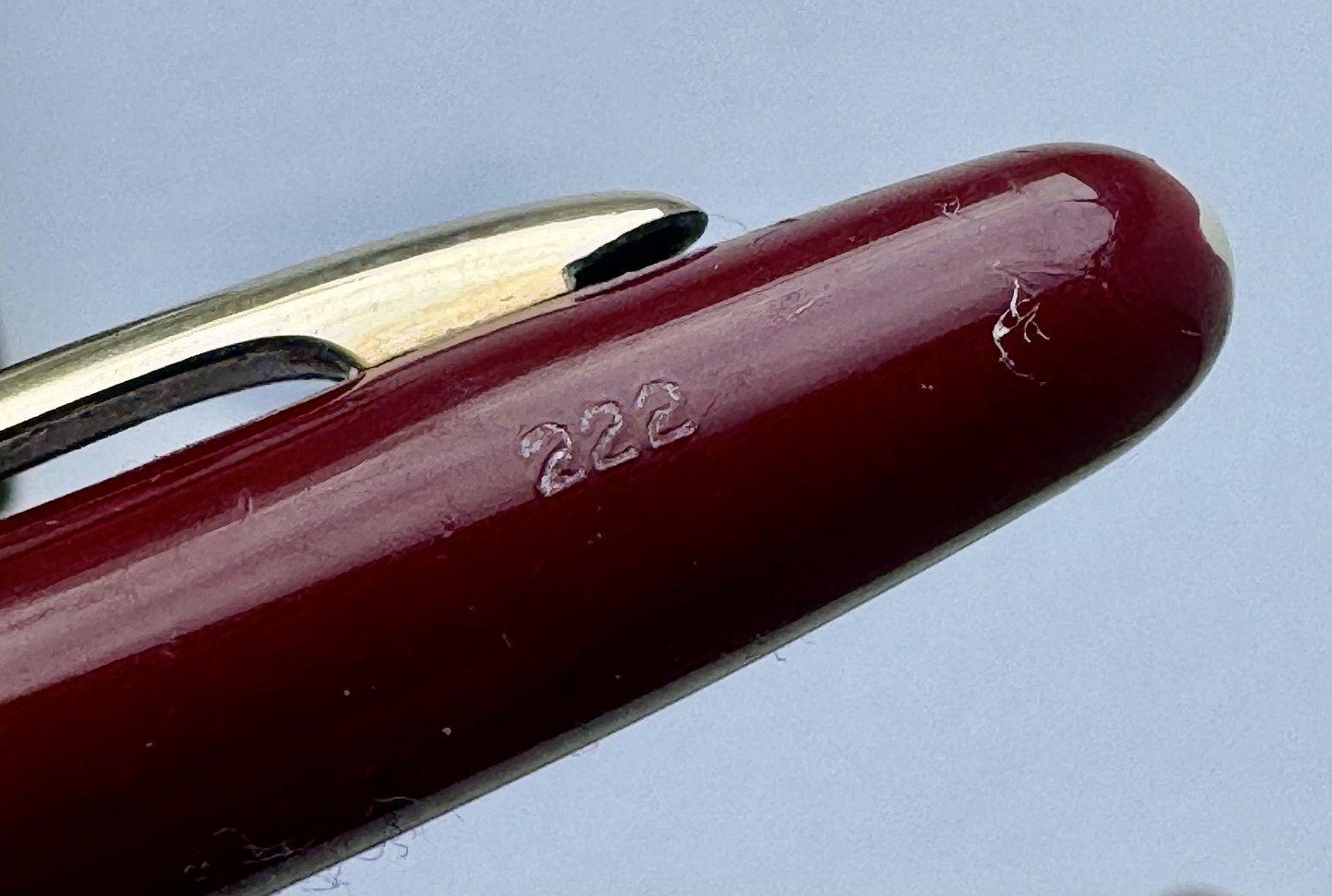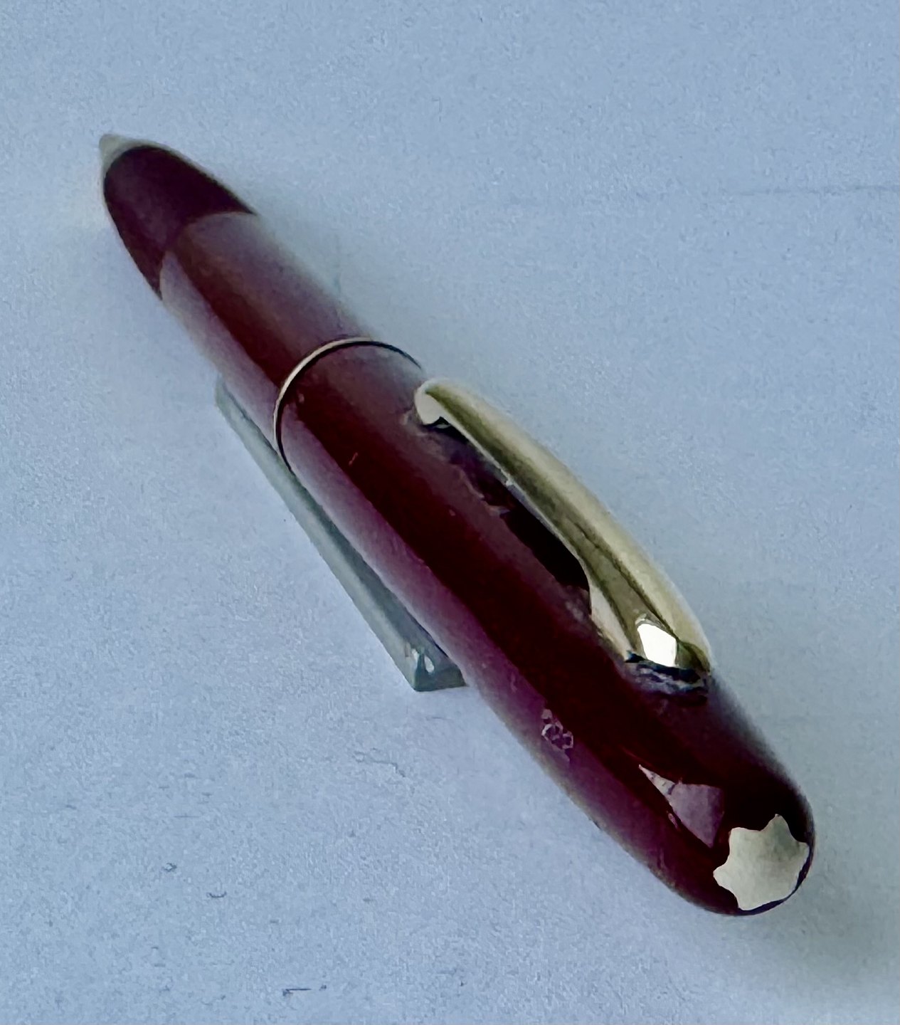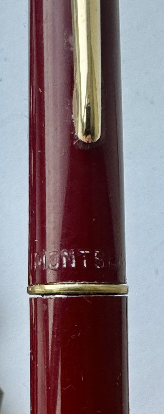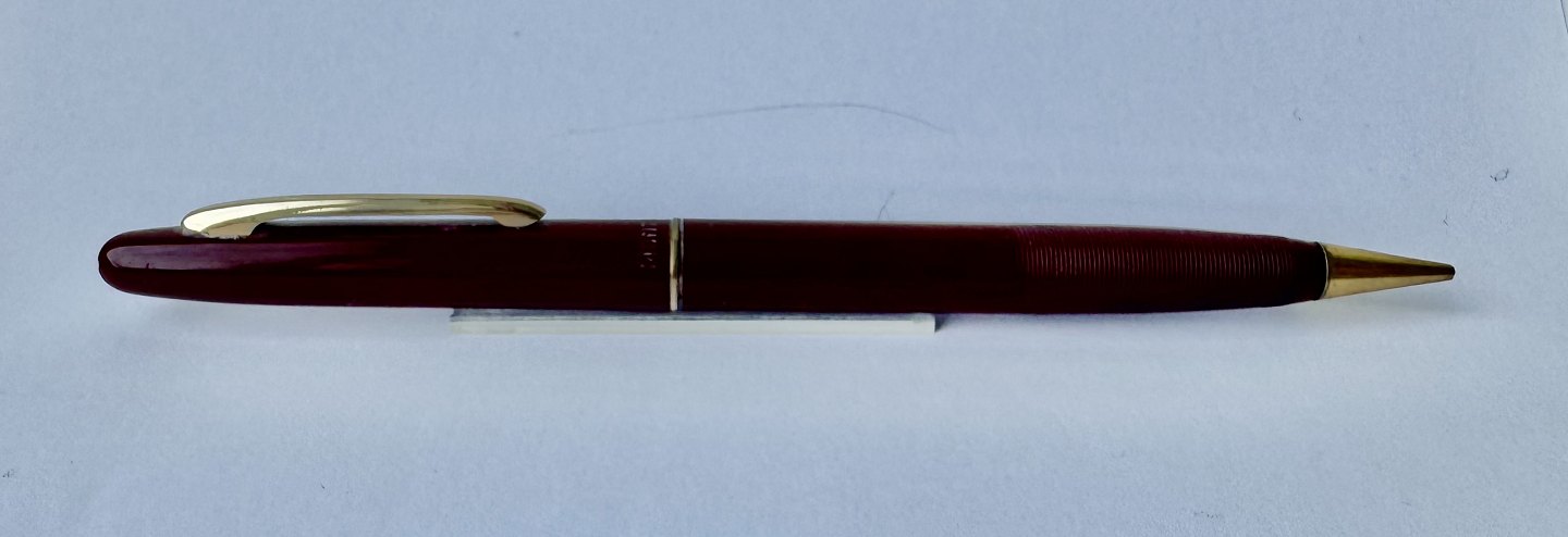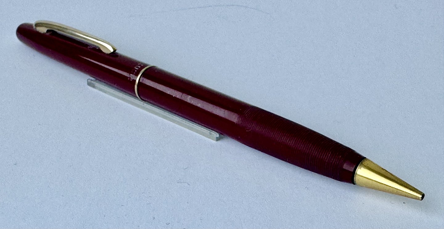 Slank Bordeaux Montblanc nr. 222 skrueblyant fra omkring 1960. Fremstår i virkelig god stand. bly-stiften kører frem tilbage når mekanismen aktiveres. 13,8 cm lang