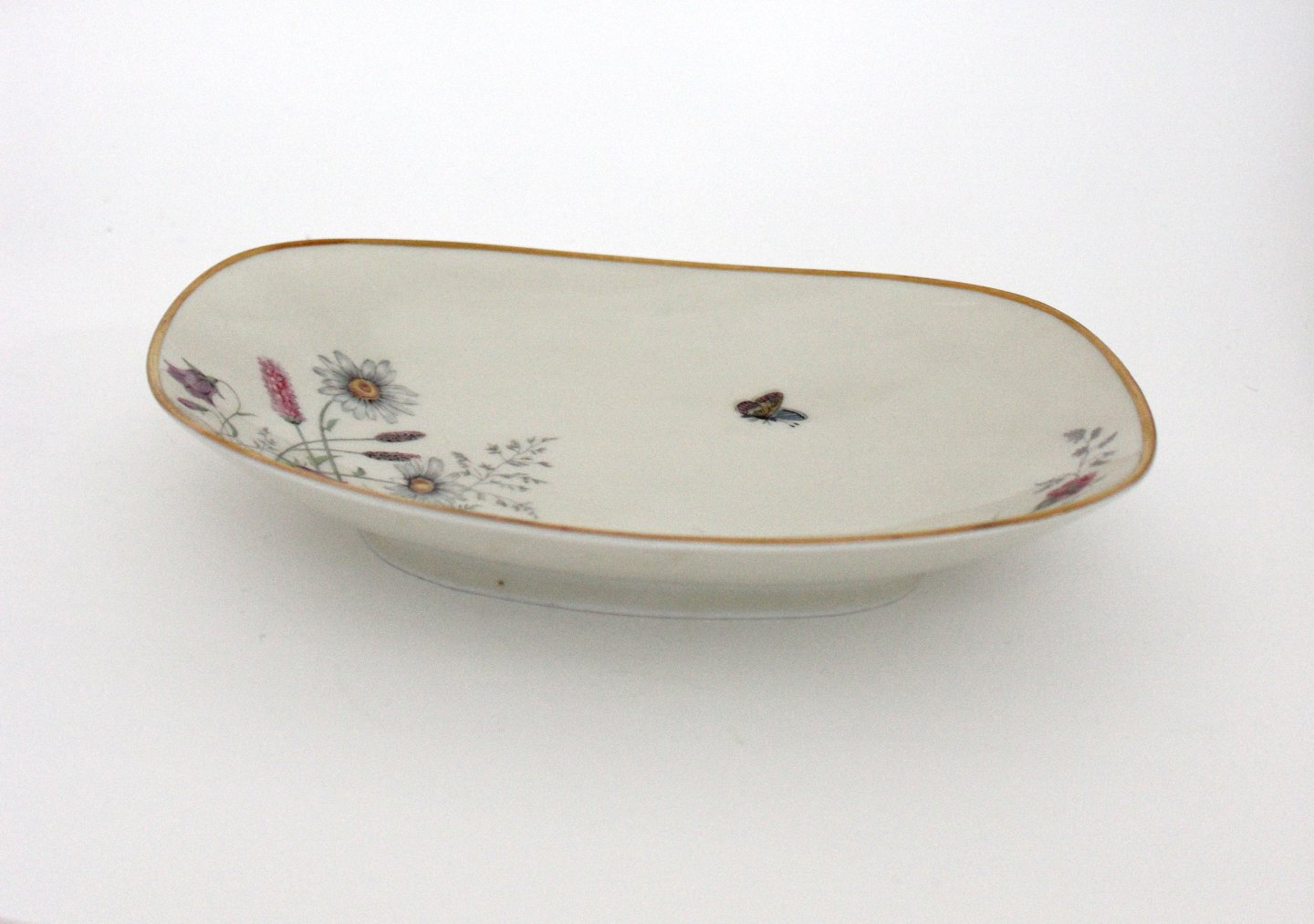 Krautheim, Selb Bavaria, Germany, Danmarks Flora cremet stel med guldkanter motiv Danmarks flora.Rektangulært fad på fod, 2 forskellige motiver. Længde 22 cm. Bredde 17,5 cm. Højde 4 cm. Pris: 175 kr. stk. Lager: 2