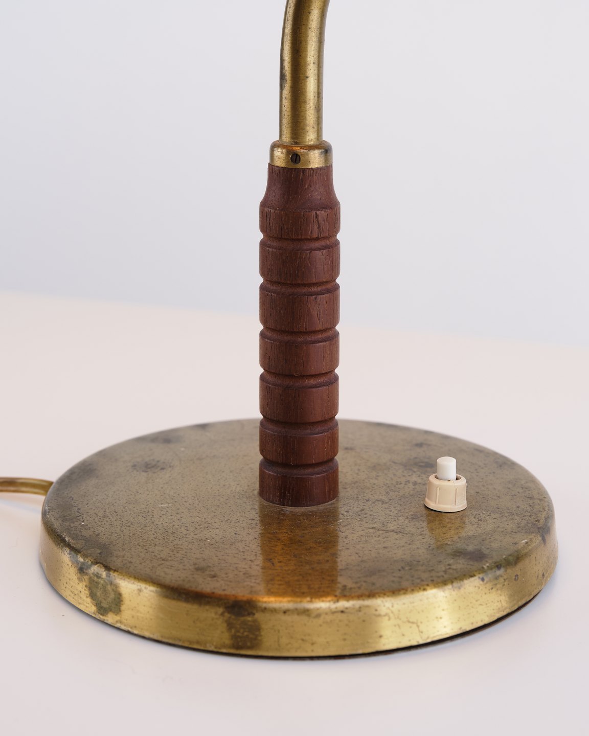 LYFA Tischlampe aus den 1930/40er Jahren aus patiniertem Messing mit Schwenkarm und originalem bernsteinfarbenem Schirm aus Schweinsleder. Klassische dänische Beleuchtung.— Herkunft: Dänemark