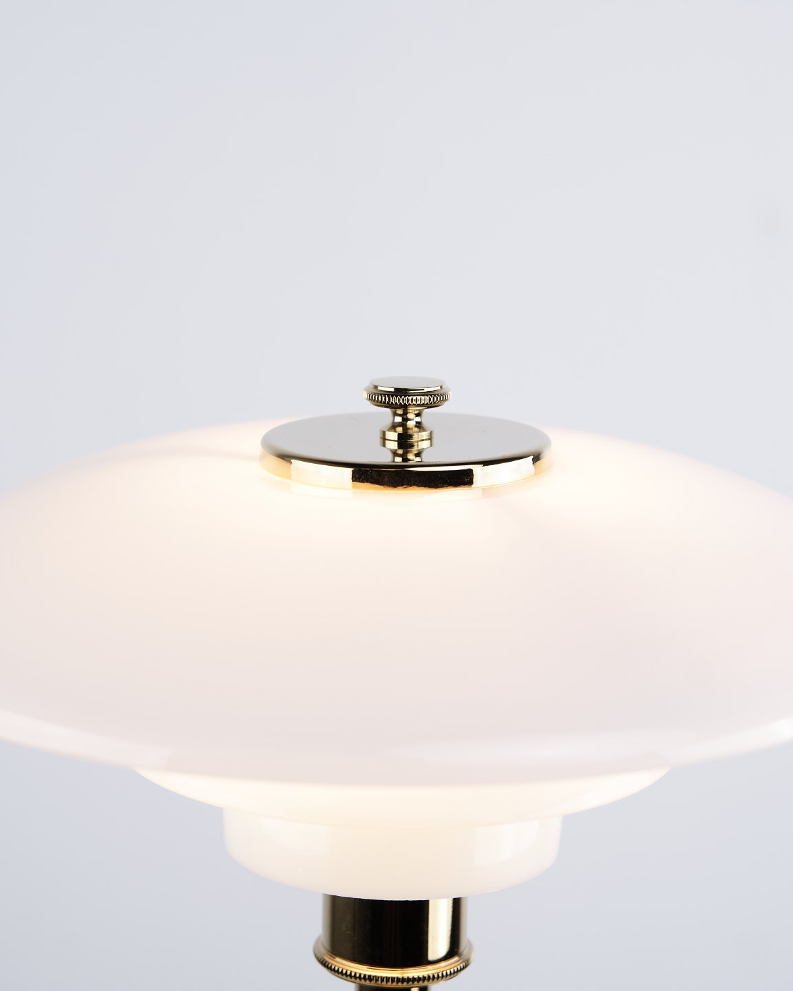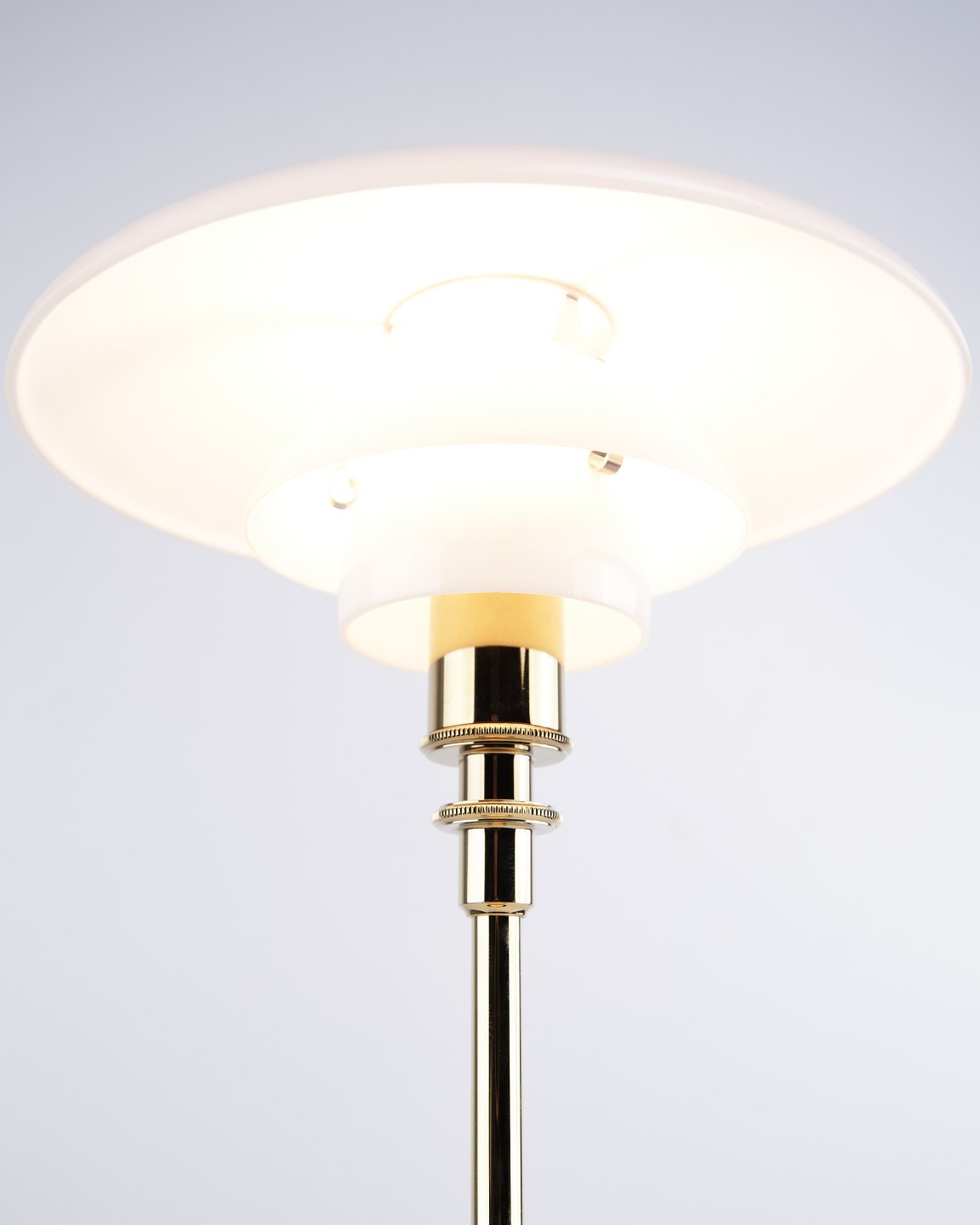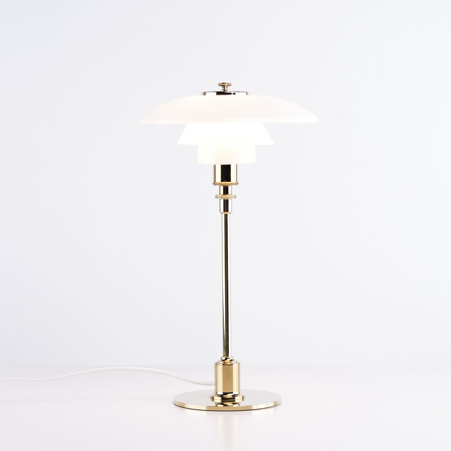 PH 2/1 Tischlampe, entworfen von Poul Henningsen und in dieser Version im Jahr 2019 von Louis Poulsen eingeführt. Die Lampe ist mit einem Fuß aus Messing und Schirmen aus weißem Opalglas ausgeführt, die ein weiches und angenehmes Licht erzeugen. Das ikonische Dreischirmsystem wurde entwickelt, um eine optimale Lichtverteilung zu gewährleisten und Blendung zu minimieren.— Herkunft: Dänemark