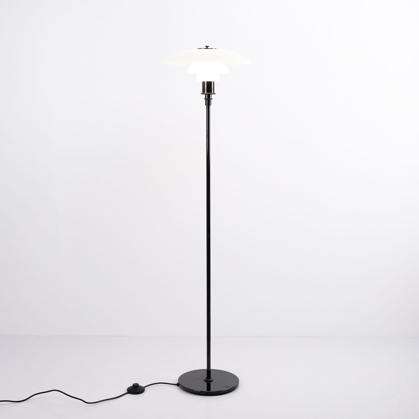 PH 3,5/2,5 Stehlampe, entworfen von Poul Henningsen und hergestellt von Louis Poulsen. Die Lampe ist mit einem schwarz lackierten Gestell und Schirmen aus weißem Opalglas ausgeführt, was ihr einen eleganten und ausgewogenen Ausdruck verleiht. Das ikonische Dreischirmsystem sorgt für ein weiches, blendfreies Licht und eine gleichmäßige Lichtverteilung.— Herkunft: Dänemark