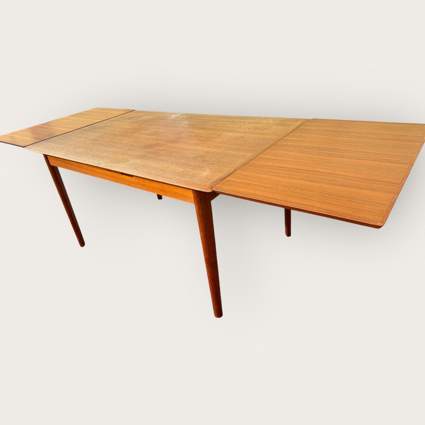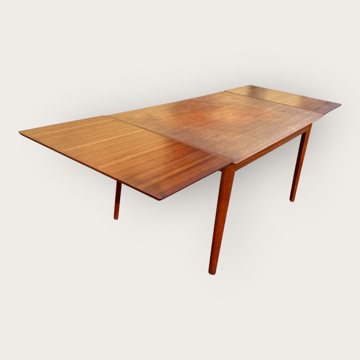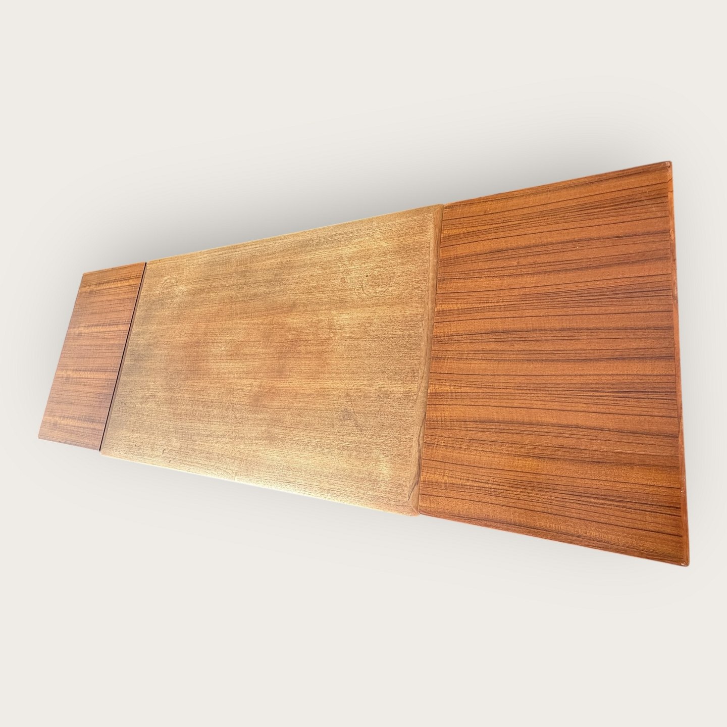 Esstisch aus Teakfurnier mit Beinen aus massivem Teakholz, dänisches Design der 1960er Jahre, gemarkt mit Ellegaards møbelfabrik und EG møbel Silkeborg Nr. 80 (siehe zwei Fotos), Maße: H x B x T 73 x 89 x 139 (240) cm * Guter gebrauchter Zustand *Lager: 1