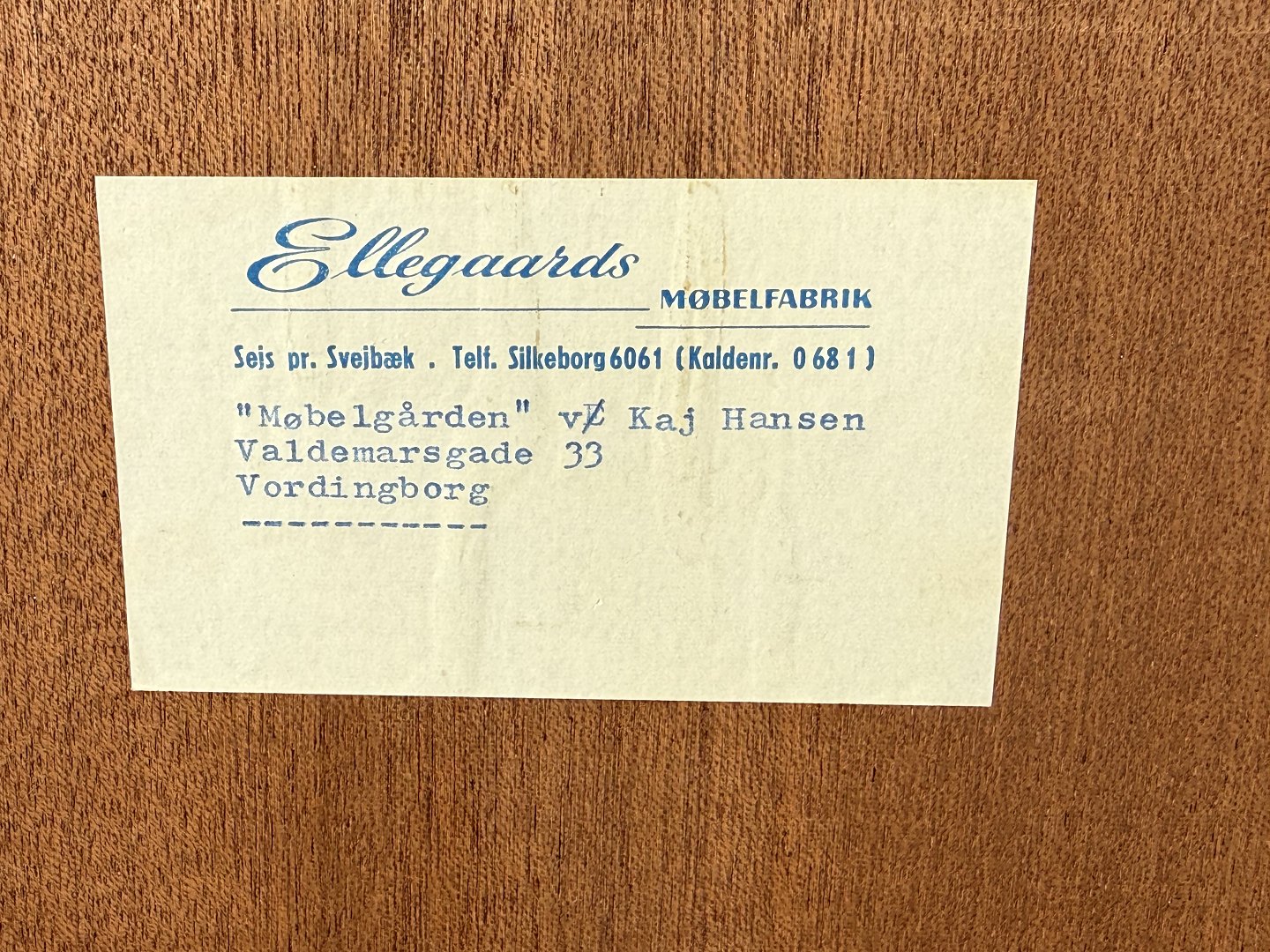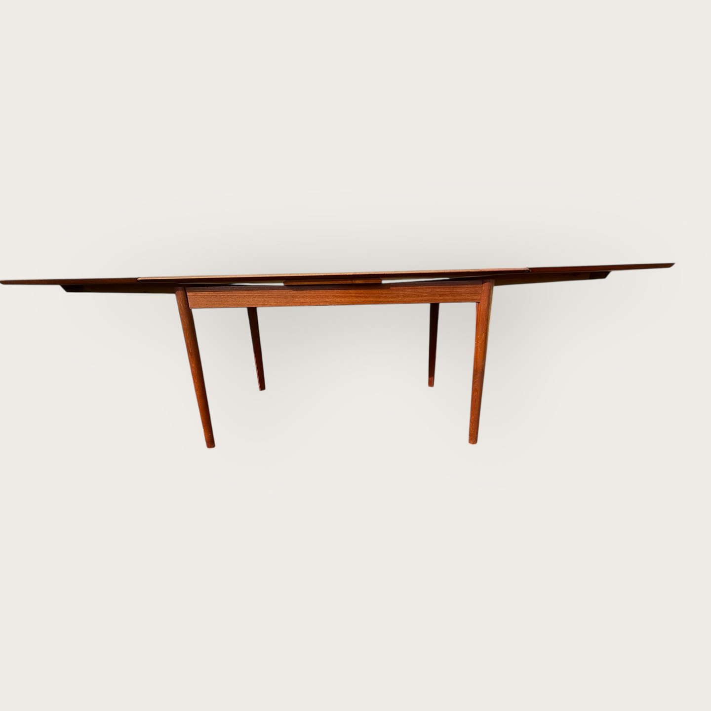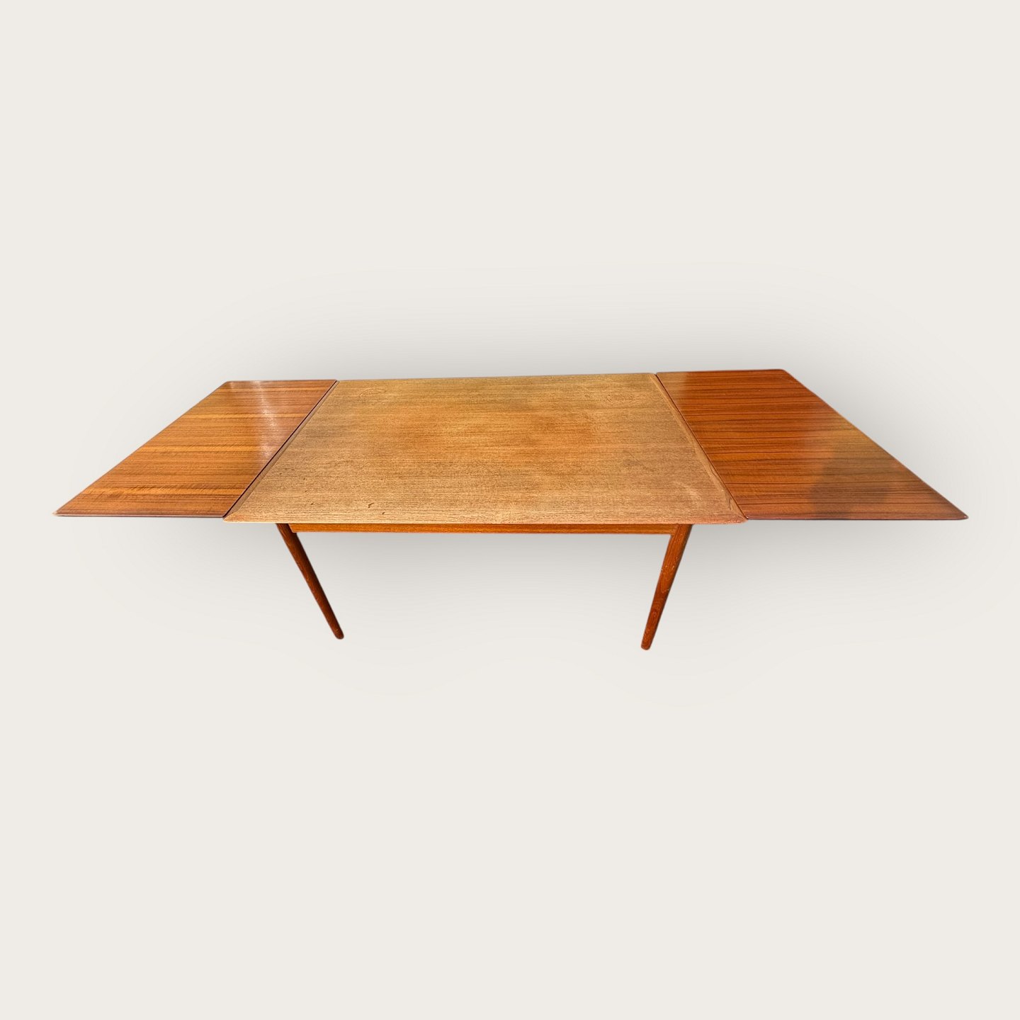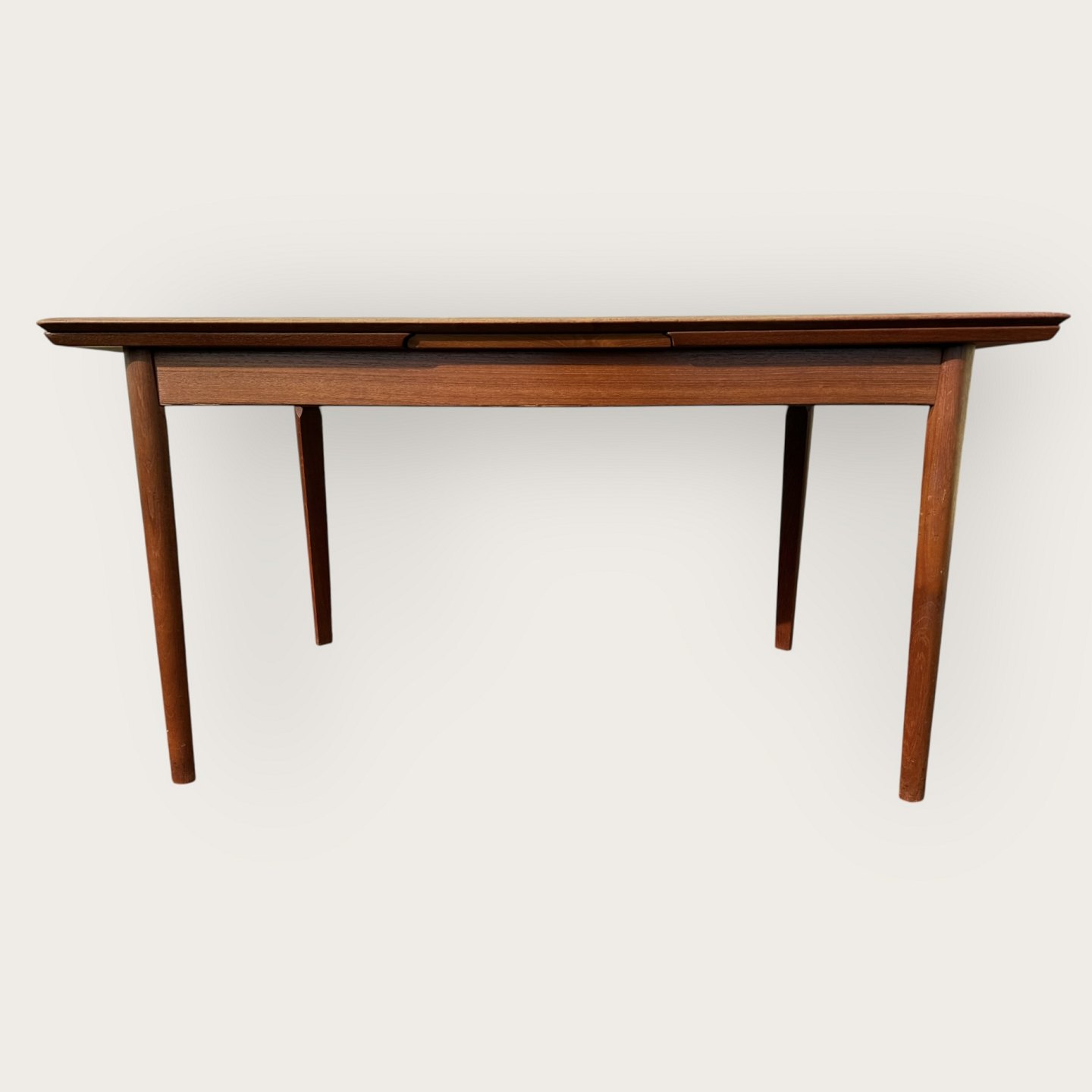 Esstisch aus Teakfurnier mit Beinen aus massivem Teakholz, dänisches Design der 1960er Jahre, gemarkt mit Ellegaards møbelfabrik und EG møbel Silkeborg Nr. 80 (siehe zwei Fotos), Maße: H x B x T 73 x 89 x 139 (240) cm * Guter gebrauchter Zustand *Lager: 1