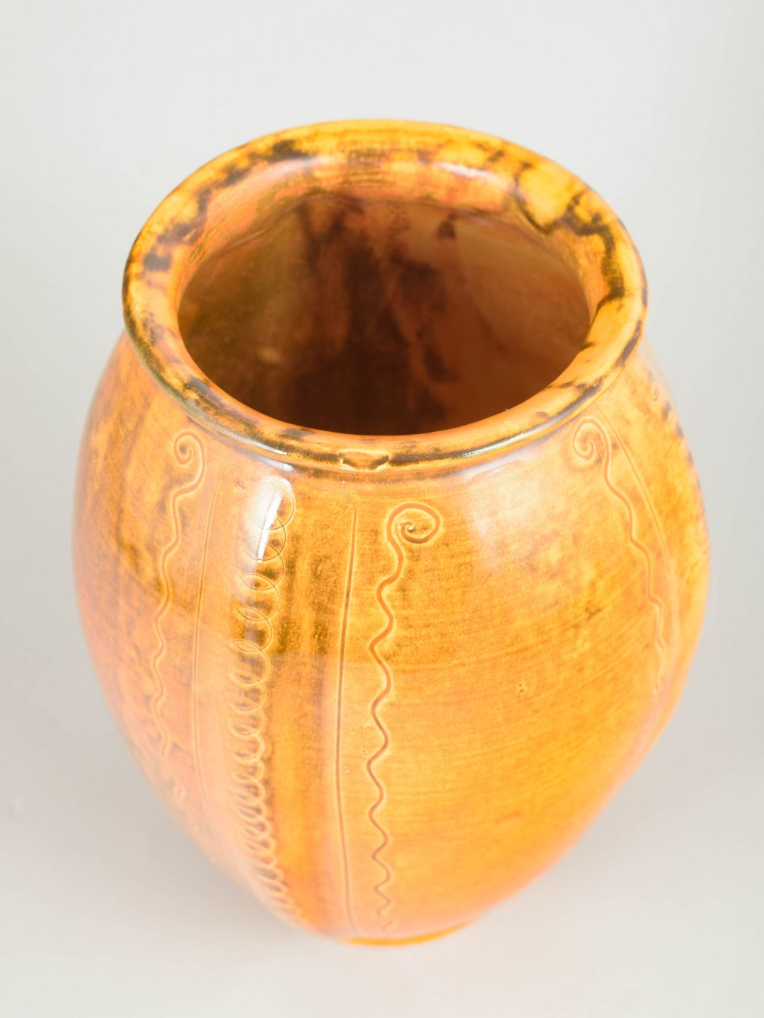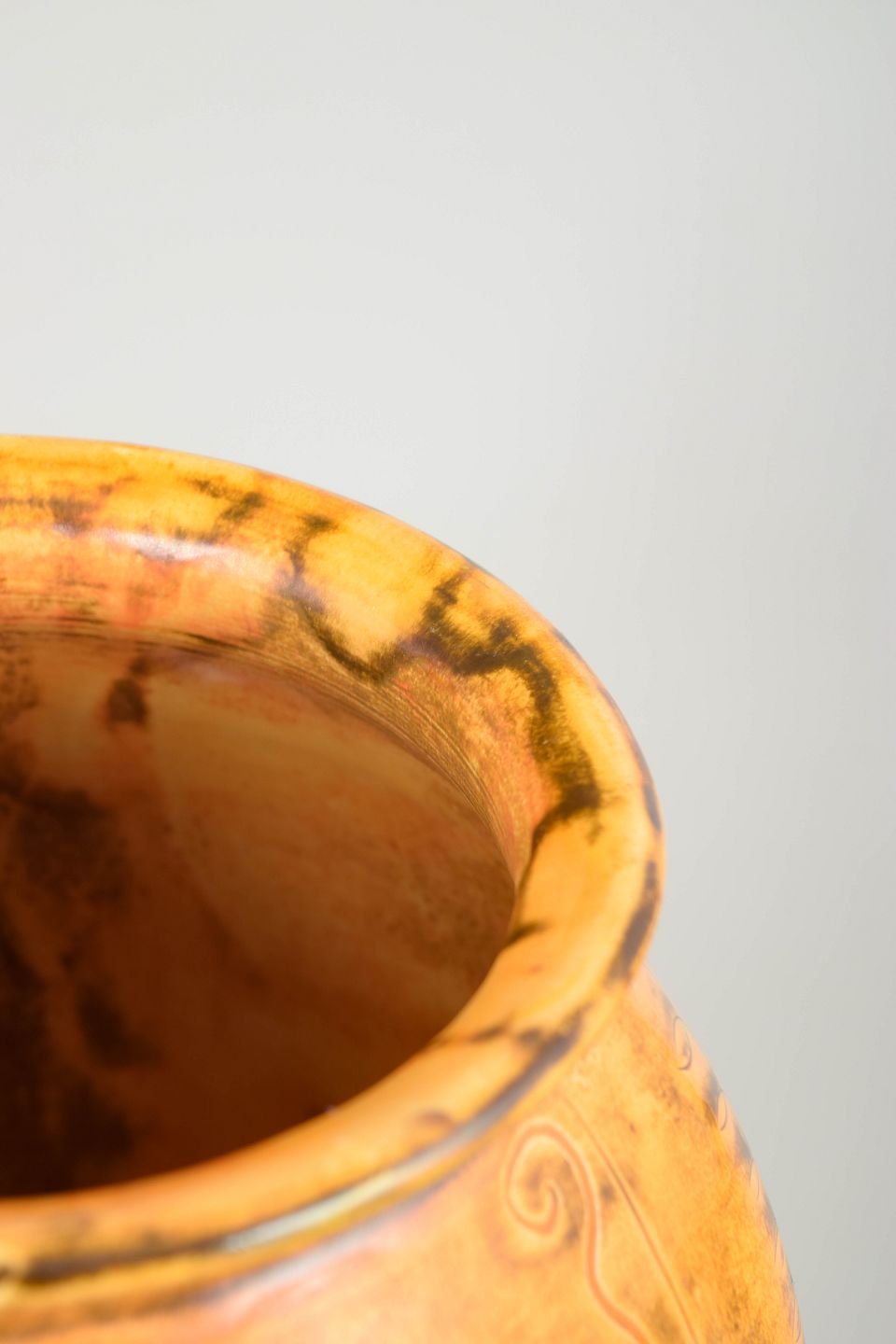 Svend Hammershøi for Kähler, vase med reliefdekoration.Stor balusterformet vase i glaseret lertøj med reliefdekorerede lodrette felter og bølgende ornamentik. Udført i lys gul glasur med varme orange nuancer og levende variation i overfladen. Signeret HAK i bunden.