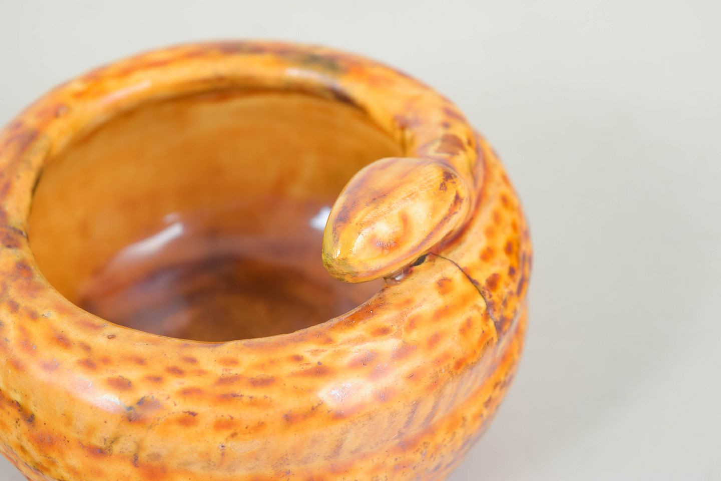 Karl Hansen Reistrup for Kähler, krukke med slange.Dekorativ krukke i glaseret lertøj med modellering af slange langs randen. Udført i kraftig gul/orange krakeléglasur med levende spil i overfladen. Signeret HAK i bunden. Fremstår med produktionsfejl i form af revne ved randen, opstået under brænding.