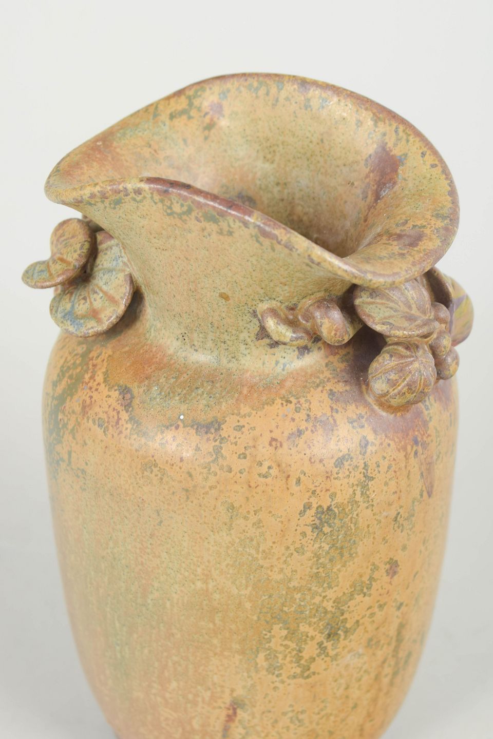 Arne Bang, vase med blade.Hånddrejet stentøjsvase med modelnummer 16, udført i organisk form med reliefdekoration af blade ved halsen og dækket af levende glasur i varme jordfarver med nuancerede overgange.