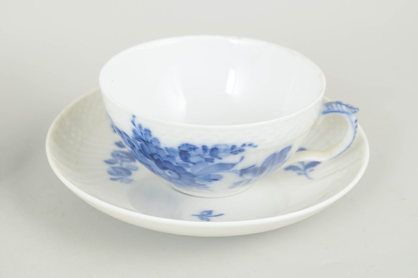 Royal Copenhagen, Blå Blomst Svejset sæt af to tekopper med tilhørende underkopper.Sæt bestående af to tekopper med matchende underkopper i porcelæn, dekoreret med håndmalet blå blomsterdekoration i relief. Modelnummer 10/1551, 1. sortering, fra 1990’erne.