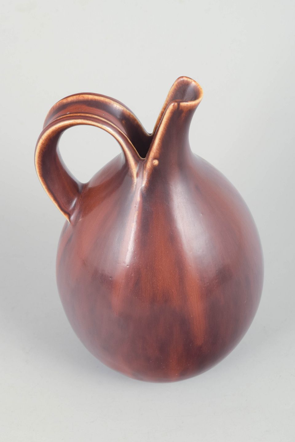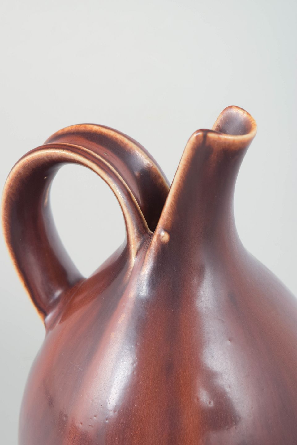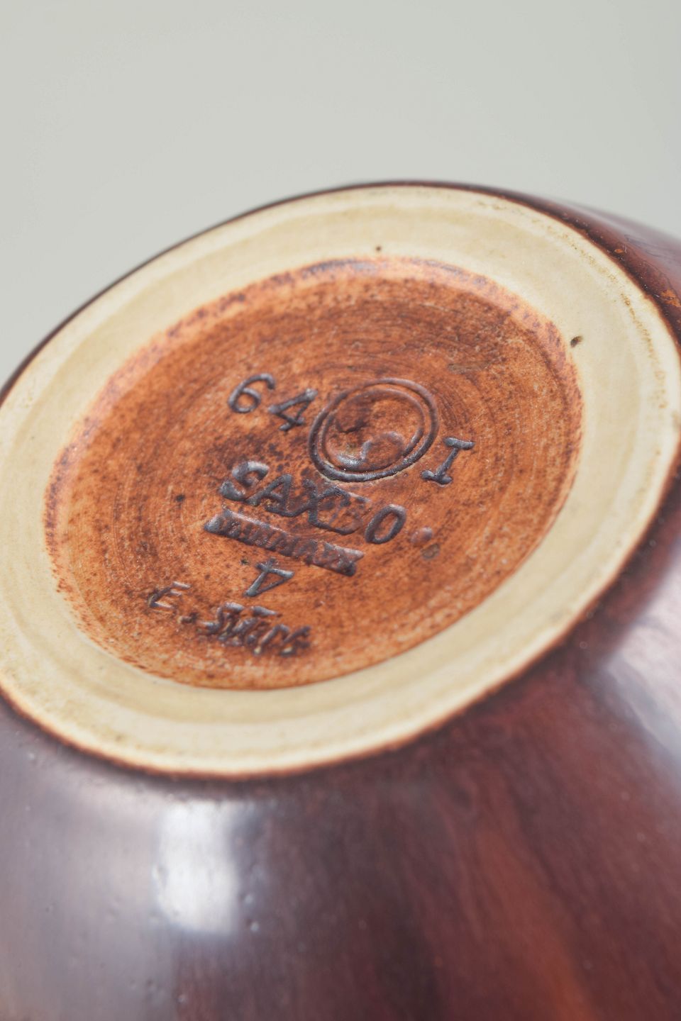 Eva Stæhr Nielsen for Saxbo, spaltekande.Organisk formet kande i stentøj med rund korpus, integreret hank og karakteristisk tud, udført i dyb rødbrun glasur med varme nuancer.