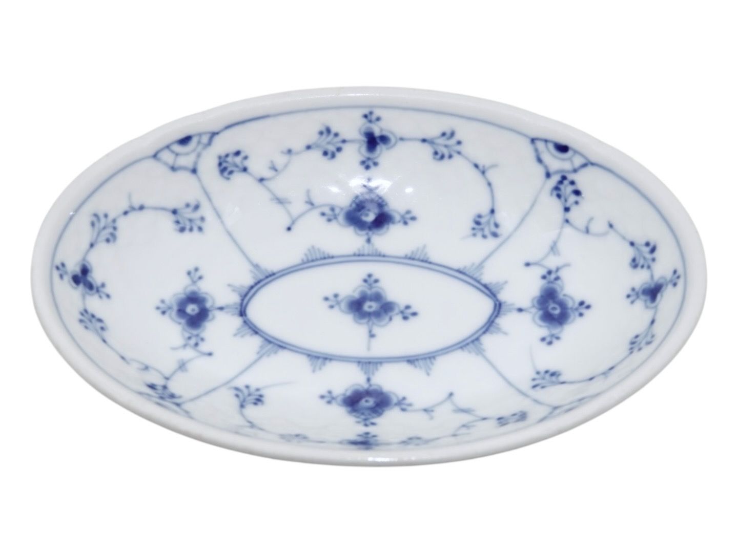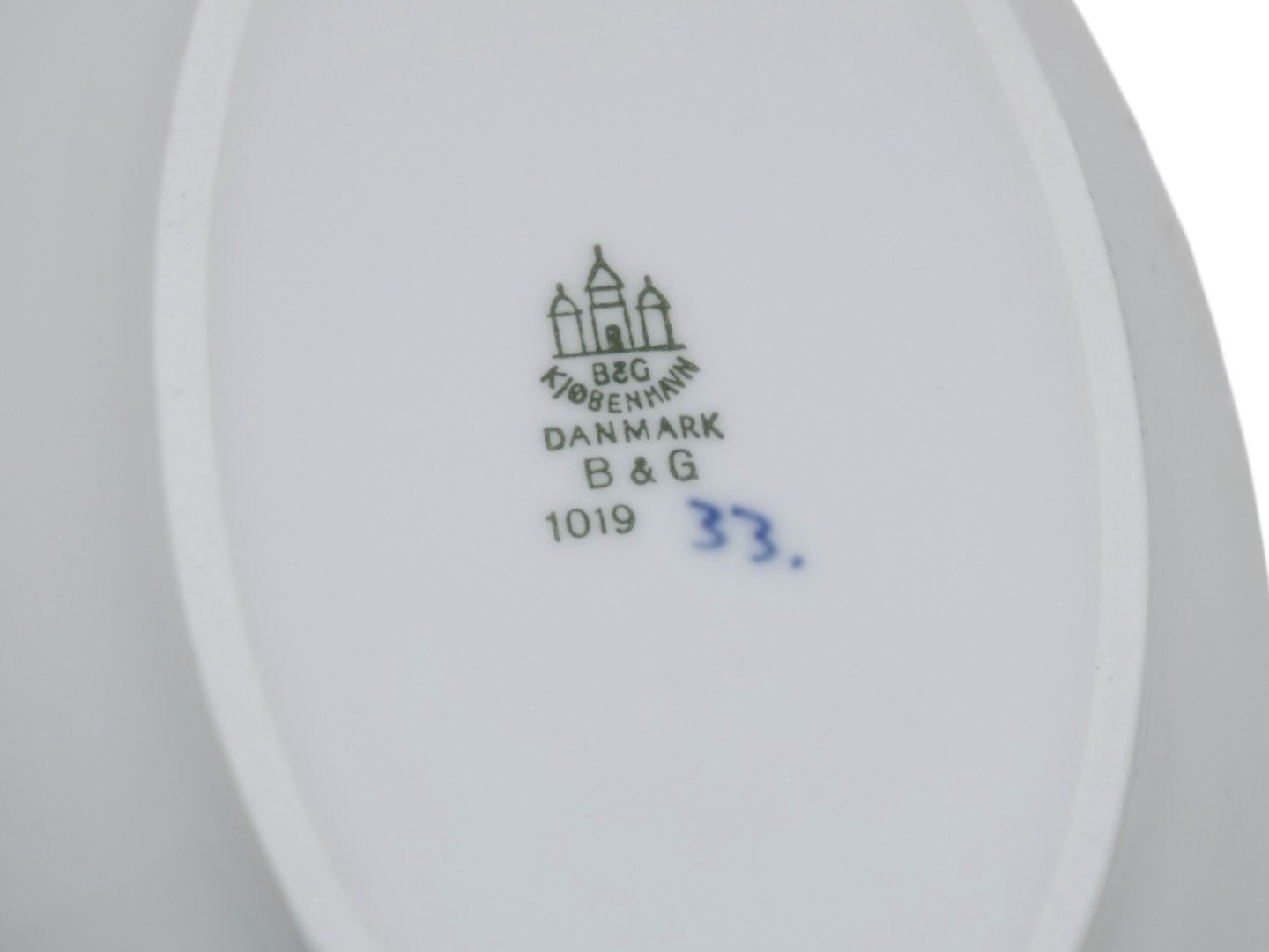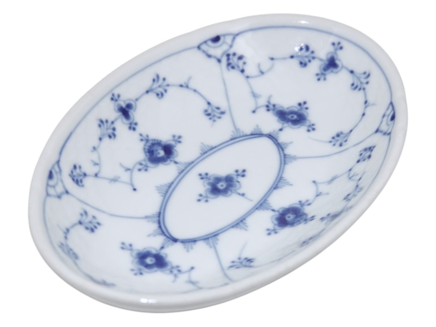 Bing & Grøndahl Blåmalet / Musselmalet tykt jernporcelæn, lille oval asiet.Af fabriksmærket ses det, at denne er produceret mellem 1948 og 1952.