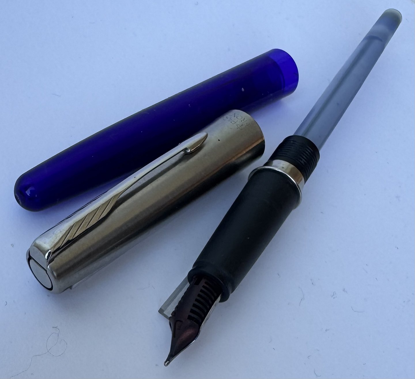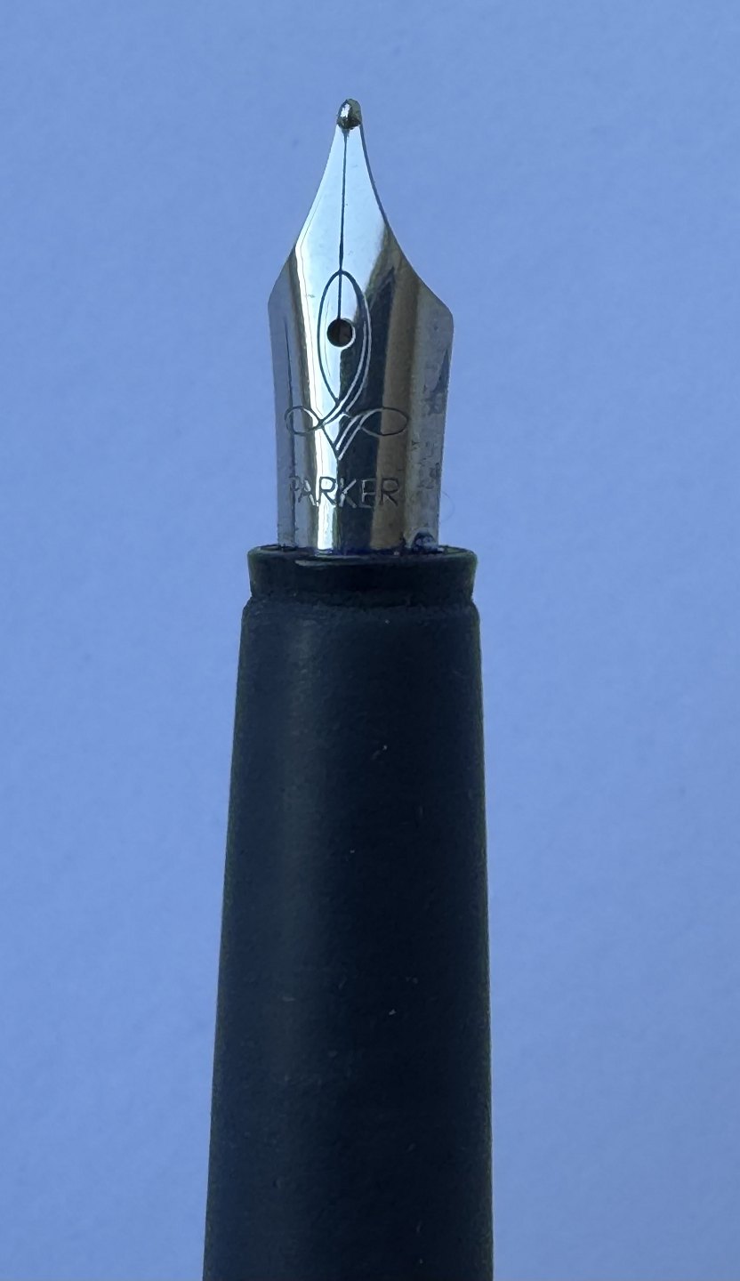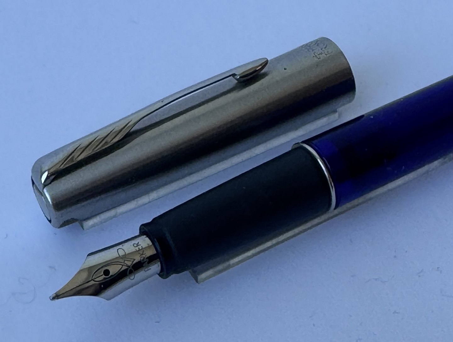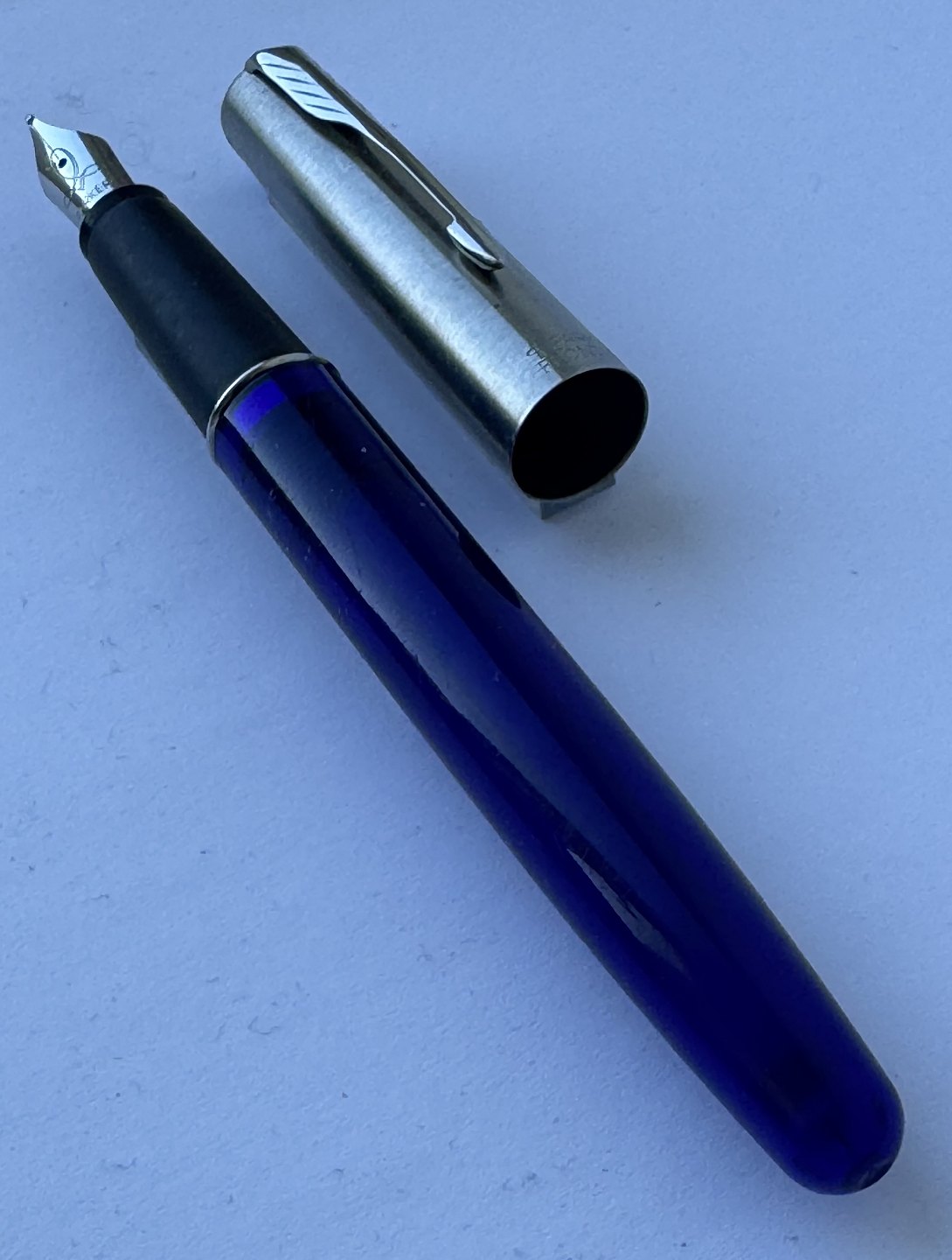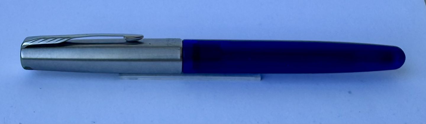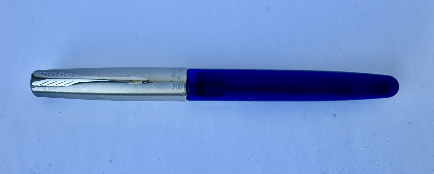 Blå Parker Frontier fyldepen med stål hætte. Fremstillet fra midt i 1990’erne. Klar til at blive brugt når der bliver indsat en ny blæk-patron. L. 13,3 cm