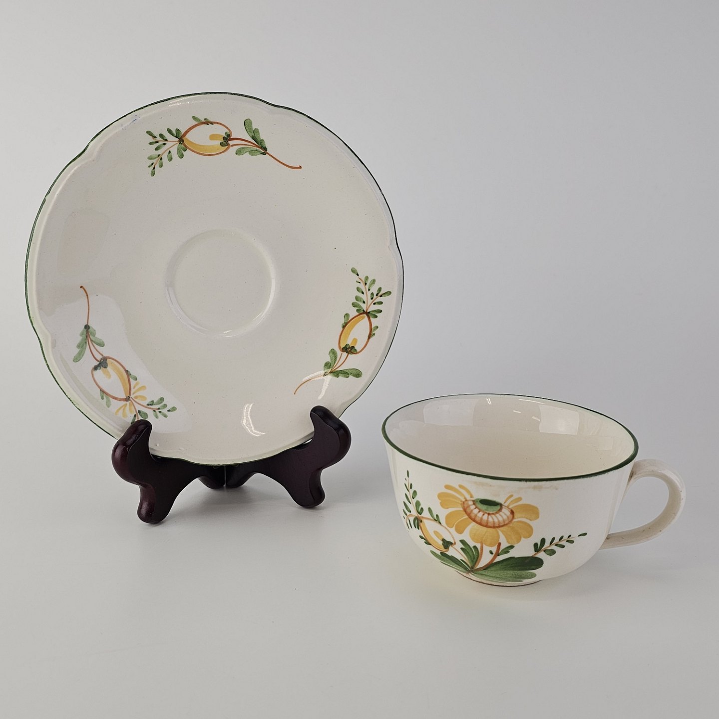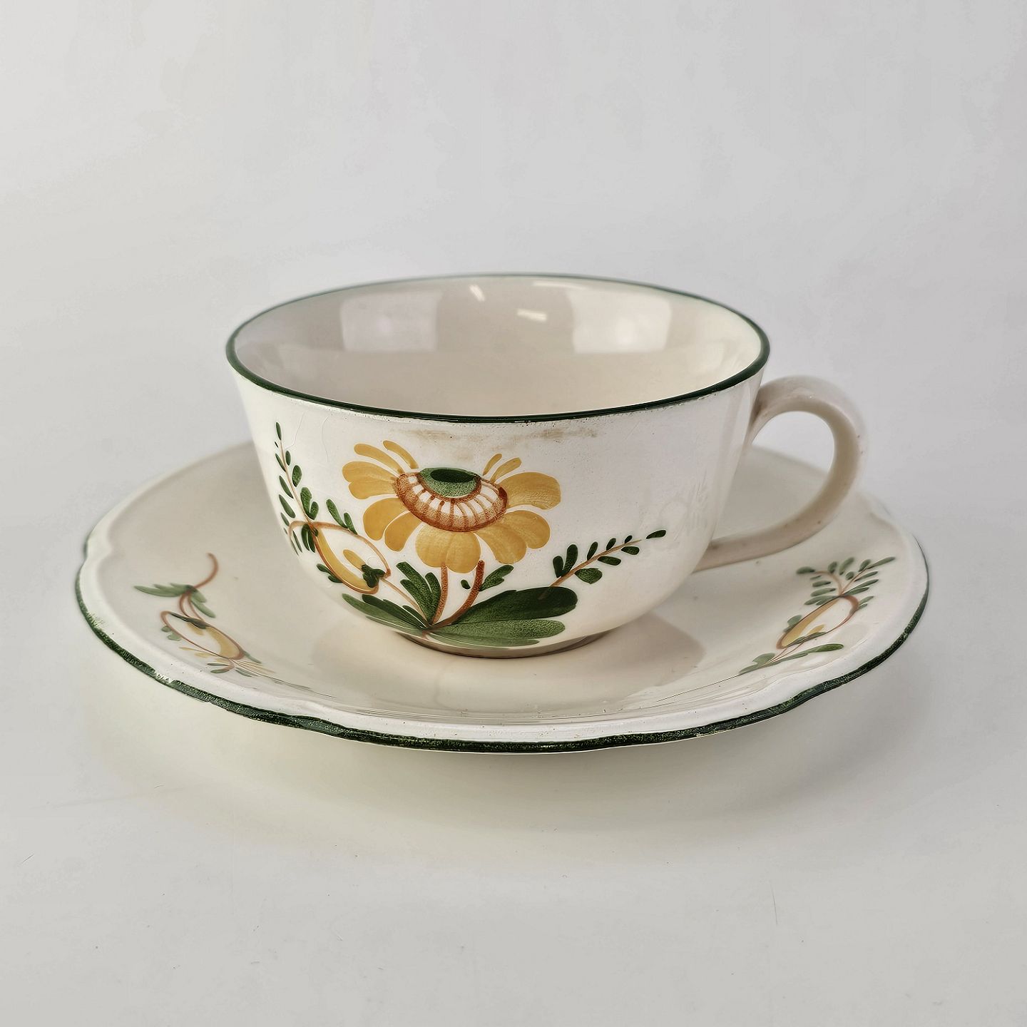 Hvidt fajancestel i stelform Feston/Alma med motiv af gule blomster og grønne blade.