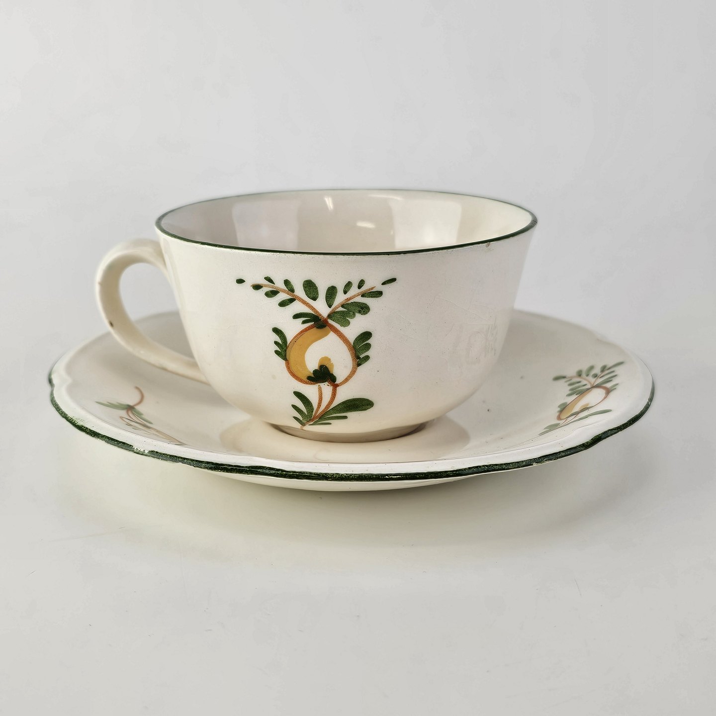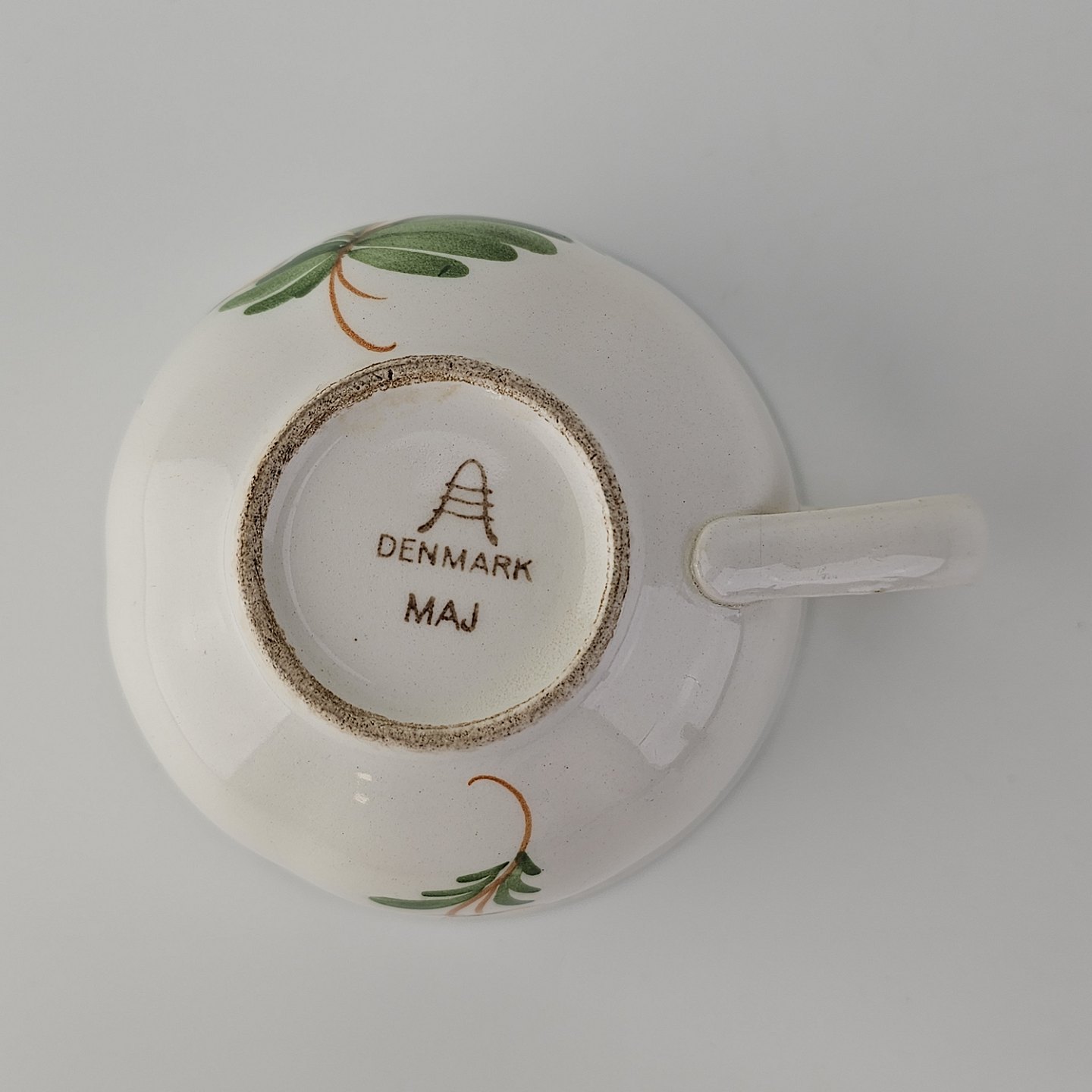 Kaffekop med underkop i fajance fra stellet Maj fremstillet i perioden 1941-1966.Formgiver Nils Thorsson