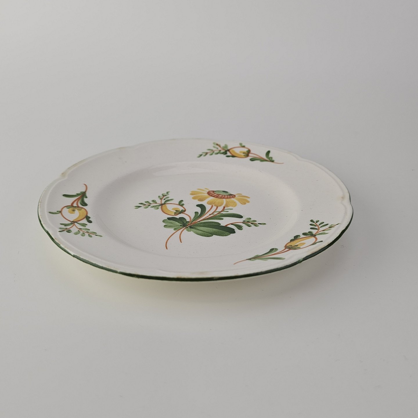 Hvidt fajancestel i stelform Feston/Alma med motiv af gule blomster og grønne blade.