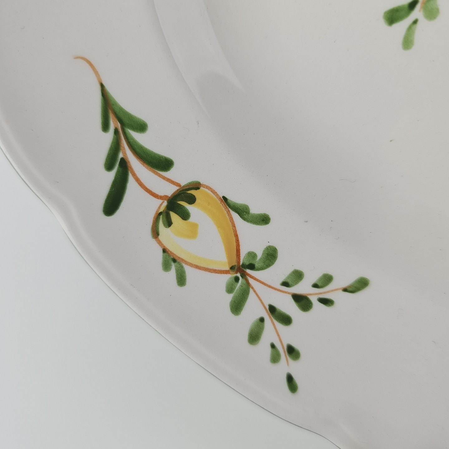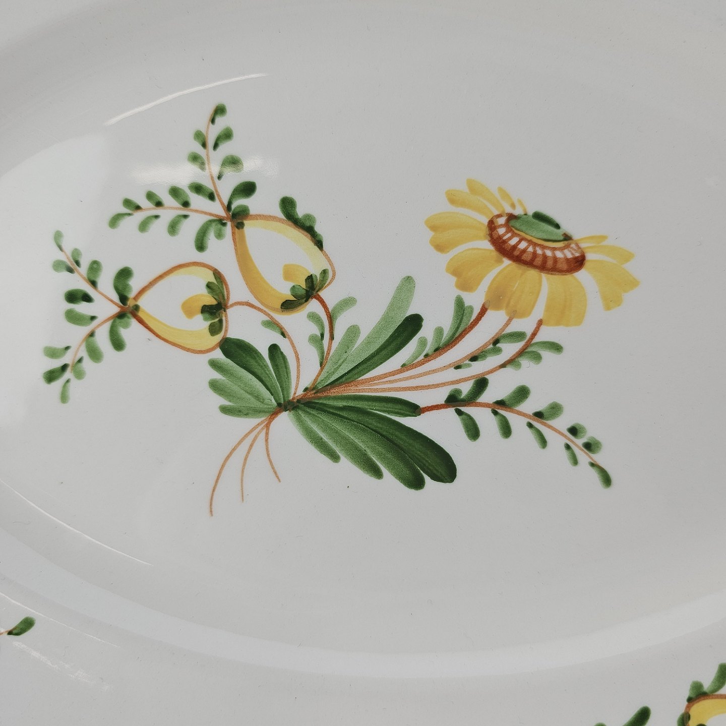Hvidt fajancestel i stelform Feston/Alma med motiv af gule blomster og grønne blade.