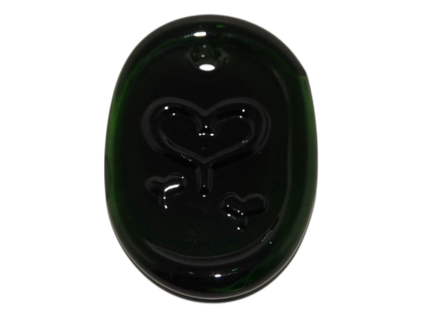 Holmegaard, lille møkregrøn solfanger med hjerte fra 1970'erne.Måler 5,7 x 3,4 cm.