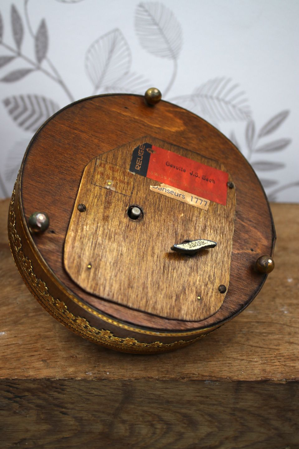 Gammel fransk mekanisk spilledåse med optræk af mærket Reuge, med et rokokopar der danser rundt...