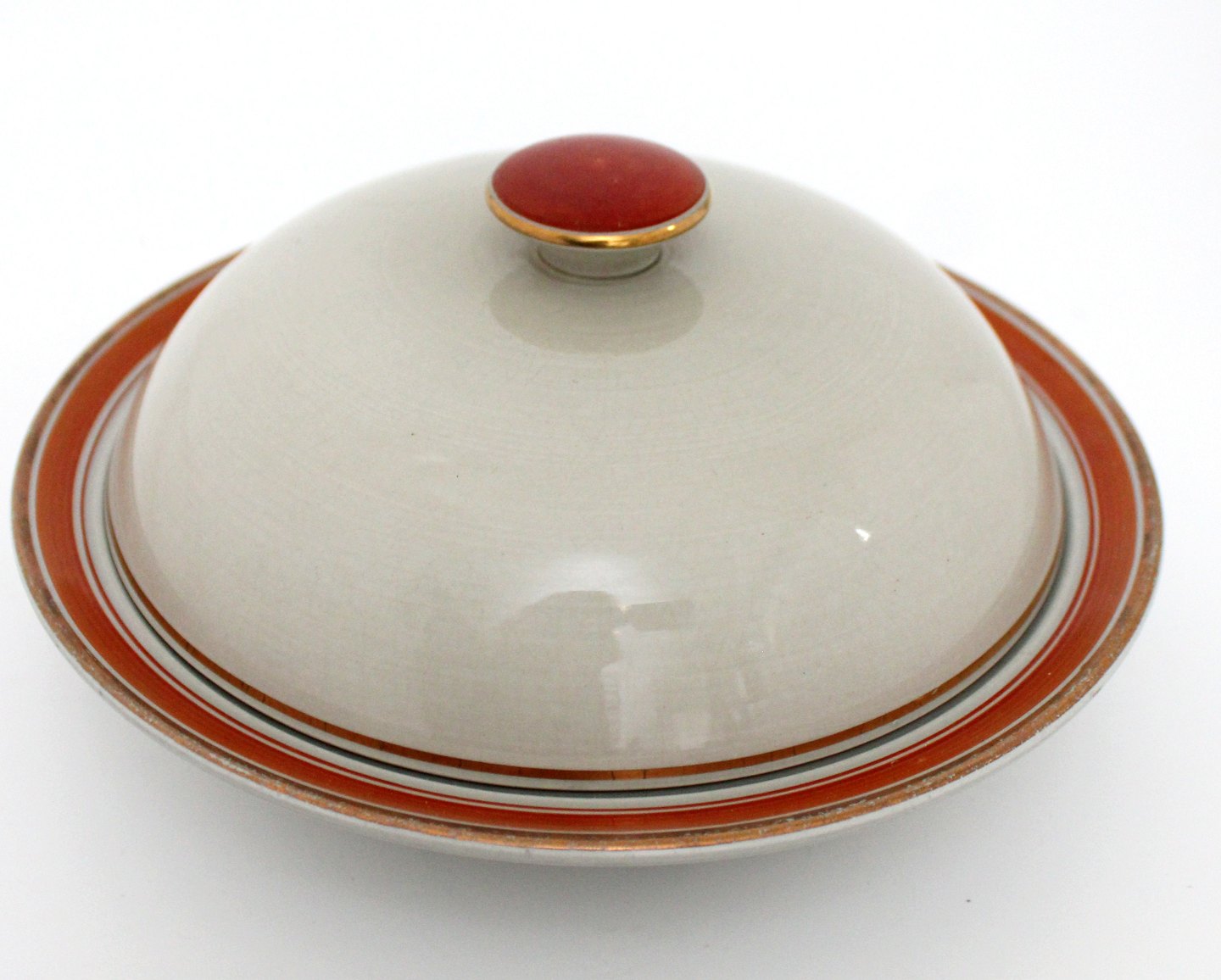 Aluminia, Tureby, grå fajance med orange fane samt guldkant. Designet af Nils Thorsson 1934-1968. Lågskål eller kompotskål, sjælden. Diameter 21 cm. Højde uden låg 4 cm. Med låg 11 cm. Fin stand. Pris: 350 kr. stk. Lager: 1